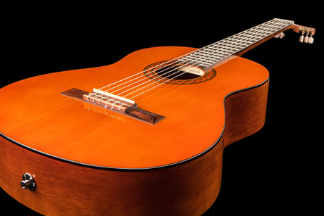 The classic Spanish guitar gives you a nice mellow sound with its figure-eight shaped wooden body and nylon strings. A perfect beginner's guitar for those who want to learn to play, or a perfect festival guitar for those who just want to hang out with friends around a campfire.