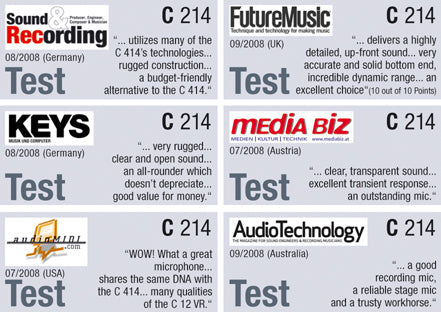 C-214 può inoltre gestire un'alta pressione sonora (156 dB SPL con interruttore att.) ed è quindi una scelta diffusa per la voce, ma anche una buona scelta per esempio per amplificatori di chitarra o "overhead" (sopra tamburi / pianoforte ecc.).