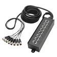10 metri di multicavo con 8 connettori XLR maschio e scatola palco con 8 connettori XLR femmina.