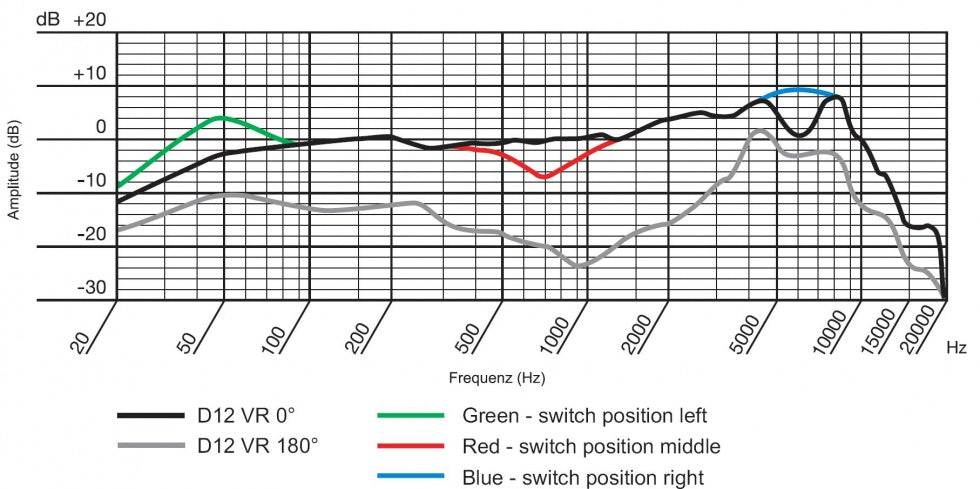 D12 VR har tre aktive filterpræferencer for at matche dens lydform med kick trommens karakter. Når den aktiveres, reduceres outputniveauet automatisk med 10 dB. Filterindstillingerne kan kontrolleres ved hjælp af en kontakt på mikrofonens krop. Uden phantom strøm fungerer mikrofonen i passiv tilstand og leverer instrumenternes rene lyd.