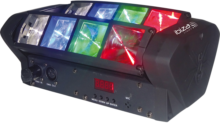 Ibiza Spider ha potenti diodi luminosi in rosso, verde, blu e bianco che creano fasci di luce nitidi.