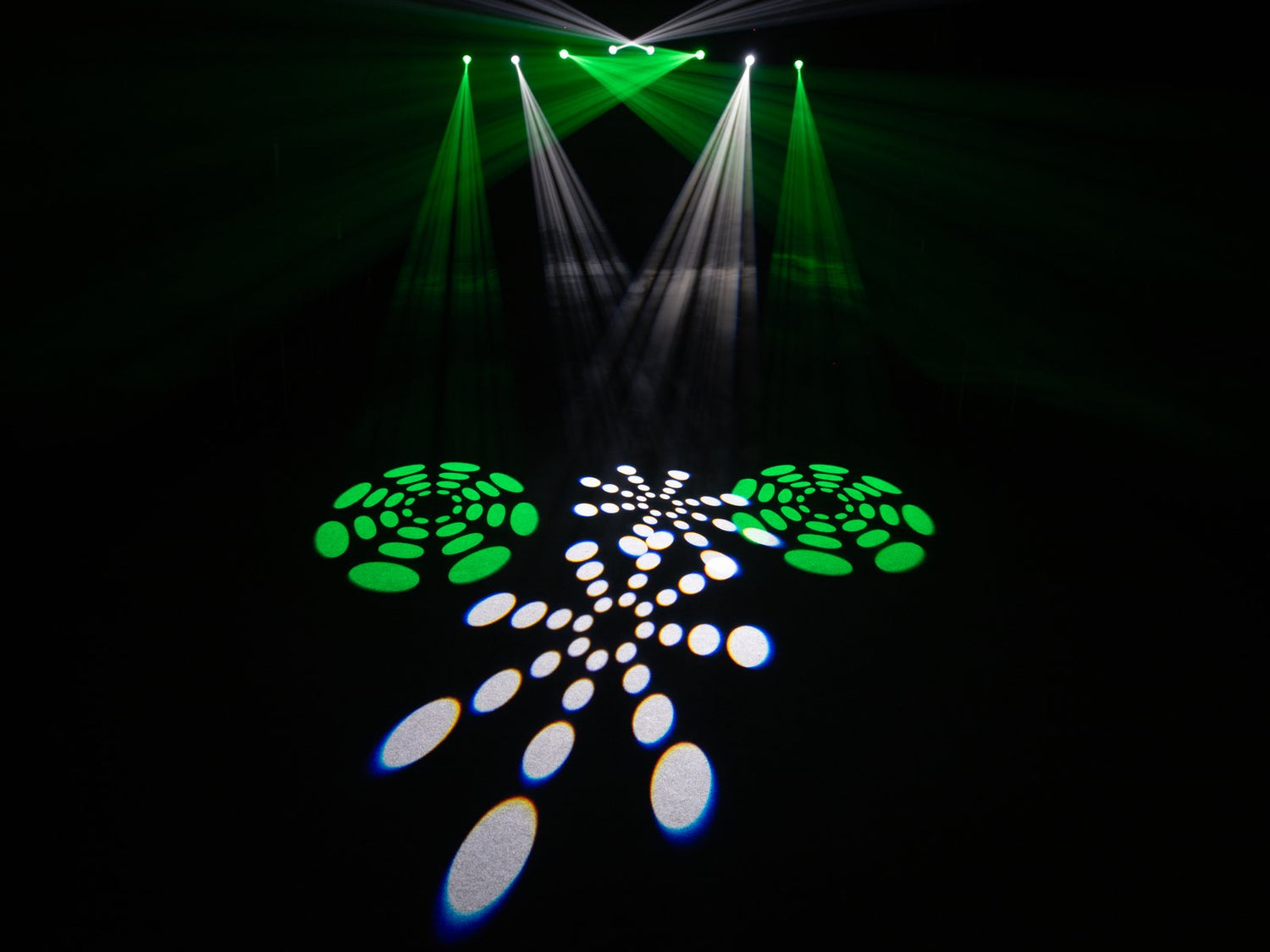 - 4 individually controllable 30 W moving heads with COB LEDs for intense brightness.