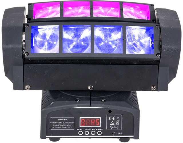 Con Ibiza Spider hai una testa mobile che crea effetti di sweeper belli e dinamici con barre LED 2x 4 lenti RGBW suddivise in 8 zone.