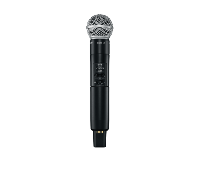 Handheld wireless SLXD2 SM58 microphone ideal for live sound and performance with good range and battery life.