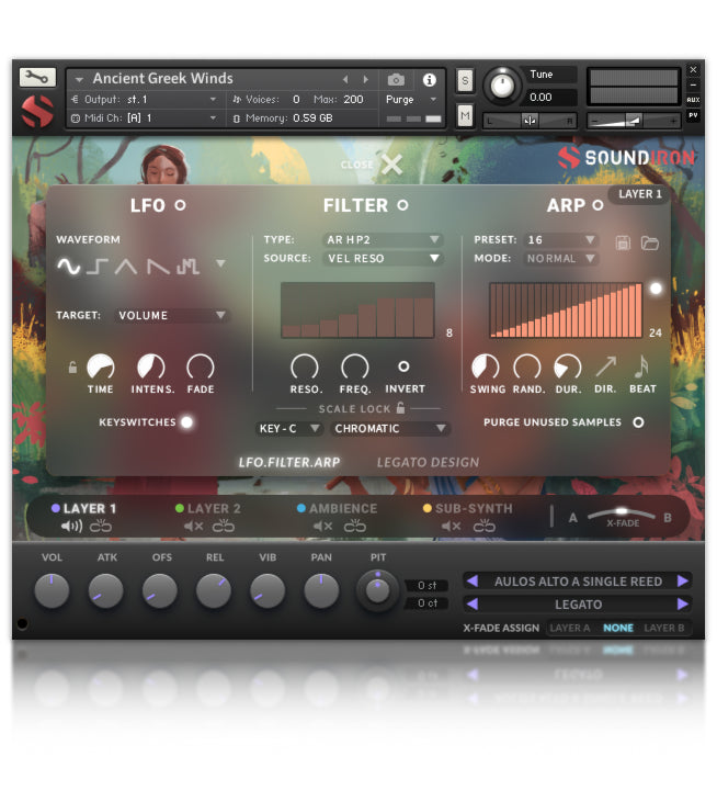 Ogni strumento è stato registrato in dettaglio preciso dal produttore John Valasis, con variazioni round-robin e molteplici dinamiche e voicing. Ti piaceranno le nostre funzionalità GUI flessibili e una vasta selezione di articolazioni cromatiche ed effetti speciali. L'interfaccia fornisce controlli completi delle performance, inclusi il controllo della risposta legato vero, la flessione portamento simulata, l'arpeggiatore, un filtro sequenziabile a passi flessibile e sistemi LFO e un rack FX DSP modulare per modellare il tuo suono come desideri. Abbiamo anche creato 20 ambienti sonori unici progettati direttamente dalle registrazioni acustiche grezze per darti una maggiore texture e ancora più potenziale creativo. Ancient Greek Winds include 3.517 campioni stereo a 24 bit 48kHz e pesa poco più di 4 GB.