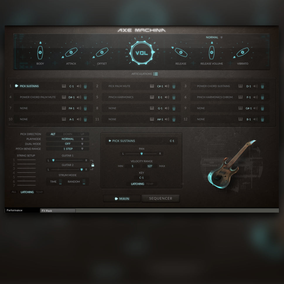 Abbiamo campionato sustain di note singole e power chord con variazioni di palm mute. Troverai anche una varietà di SFX, come armoniche pinch, mute, scrapes con plettro con velocità lenta, media e lunga, rumore di tasti, chokes, rakes e slides. Sintonizza il tuo tono da sogno inviando il nostro segnale D.I. puro attraverso i tuoi plugin di simulazione amp preferiti, o usa il nostro tono reampato personalizzato, creato con il software Neural DSP. La nostra GUI flessibile ti dà accesso alla selezione di articolazioni in tempo reale e alle funzionalità di performance, opzioni di key-switch e mapping, arpeggiatore, auto-strummer, sequencer e un rack FX completo, tutto racchiuso in un'interfaccia utente intuitiva e personalizzabile.