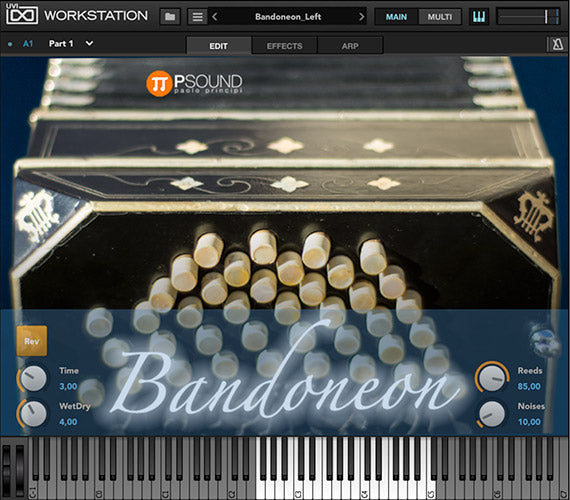 Il Bandoneon consiste in una riproduzione filologica di un storico Bandoneon Alfred Arnold realizzato in Germania negli anni '50! Il suo suono tipico è basato su 2 ance (Zinc) per ogni nota. Il PSound Bandoneon è stato campionato in 4 strati con 2 round robin per un totale di 440 campioni (1 GB di spazio di archiviazione)
