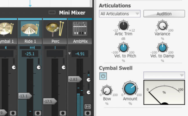The internal BFD3 mixing engine has DCAM-modelled compression, filtering and other effects alongside great-sounding EQ and algorithmic reverbs. You can even use an external signal as a compression sidechain source.