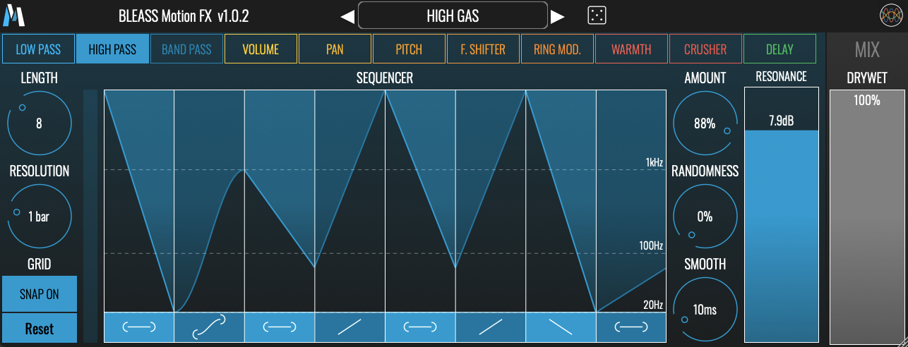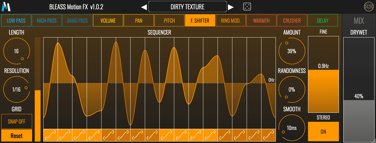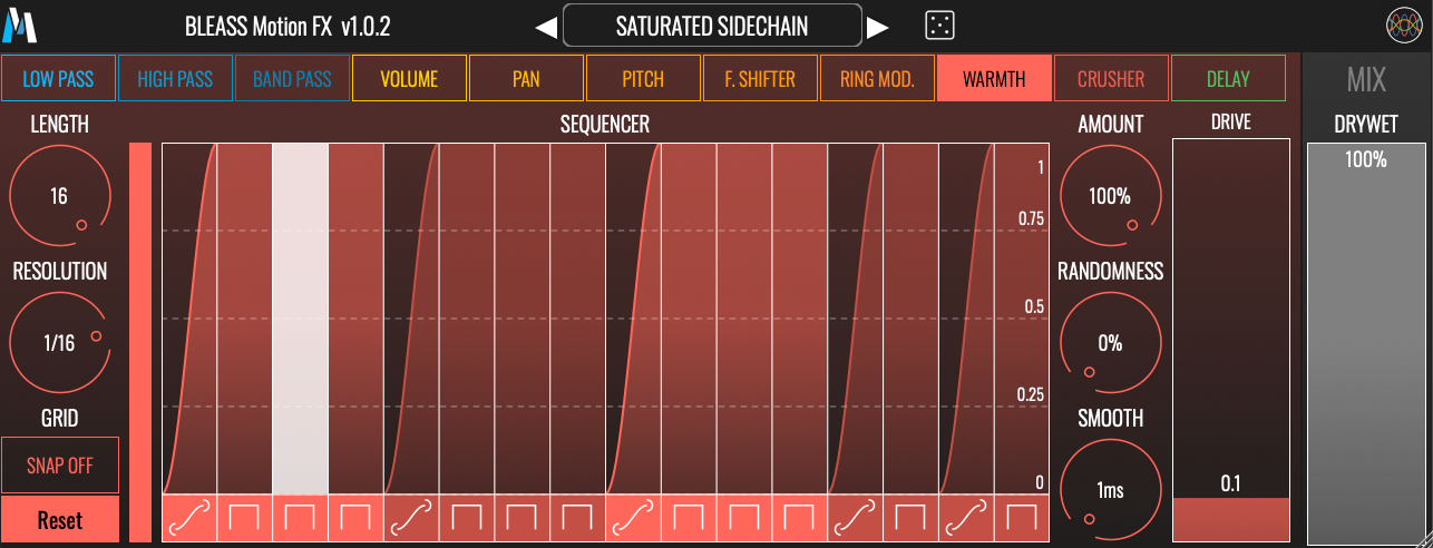BLEASS Motion FX contiene 11 effetti diversi che puoi modulare con precisione grazie a un sequencer intuitivo e completo. Scegli un effetto e modula dinamicamente grazie a un sequencer di movimento intuitivo e versatile.