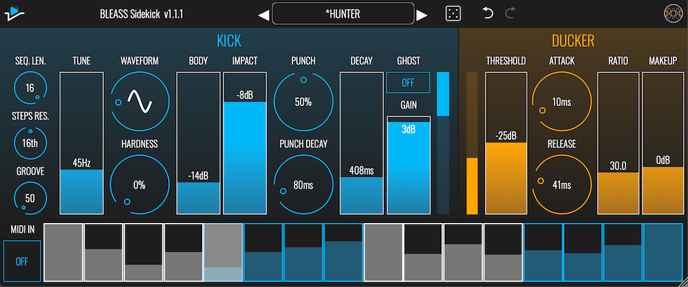 BLEASS Sidekick è un plugin versatile che combina un sintetizzatore di kick drum, un sequencer a 16 step e un ducker per effetti sidechain dinamici. Il suo motore kick in stile analogico, ispirato ai vintage beatbox, crea kick potenti e rimbombanti che possono essere mescolati con il segnale in ingresso o instradati a un canale bus separato per ulteriori elaborazioni.