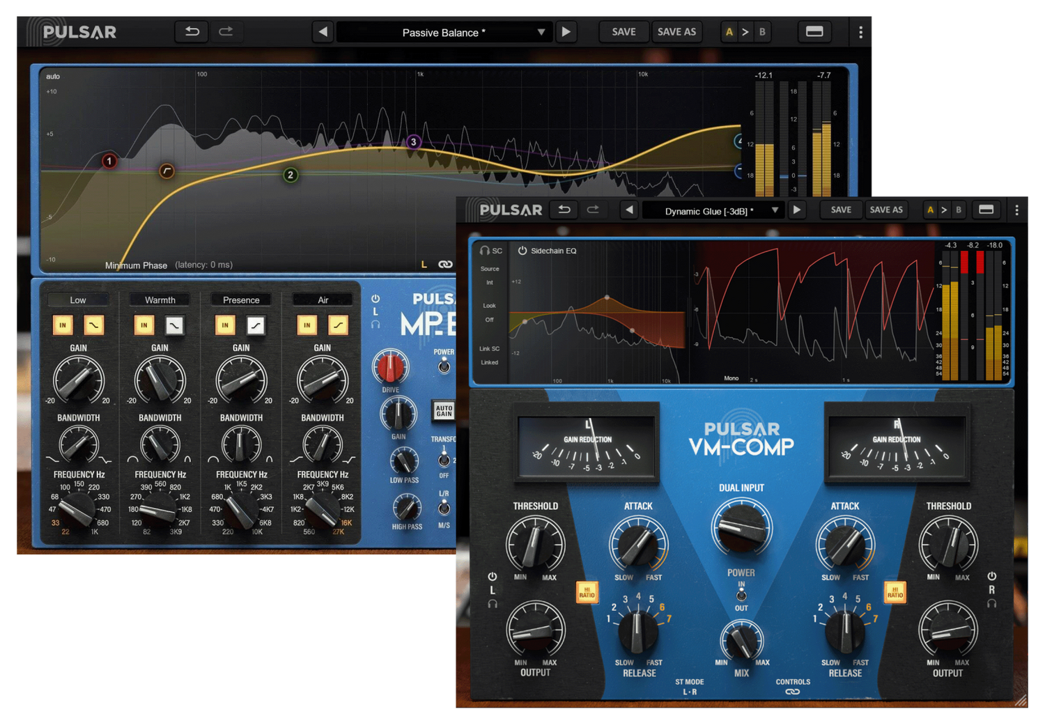 This bundle combines Pulsar’s updated passive equalizer MP-EQ and variable-mu compressor VM-COMP into a complete mastering and mix-bus toolkit. Together they deliver precise tonal shaping, transparent dynamic control, and the analog character of the original hardware designs.