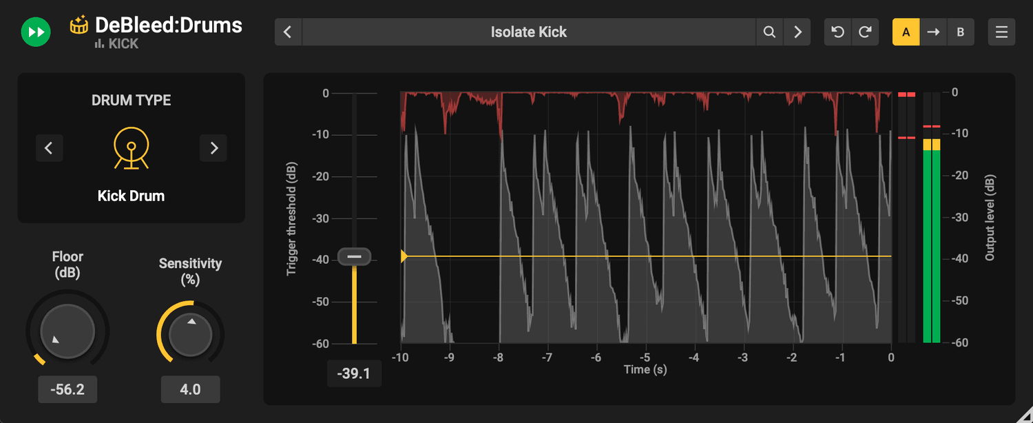 Per risultati ottimali, DeBleed:Drums sfrutta la tecnologia delle reti neurali per separare gli elementi della batteria, come kick e snare, mentre gli algoritmi DSP proteggono i transienti per una maggiore chiarezza. La sua logica di attivazione intelligente imposta soglie per rimuovere il bleed in modo efficiente, offrendo un mix di batteria più pulito e naturale.