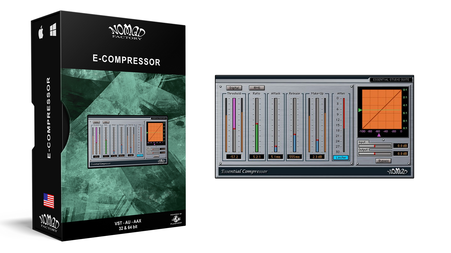 Vælg analog eller digital kompression, samt Peak eller RMS kompression. Denne kompressor giver intuitiv kontrol over Threshold, Ratio, Attack, Release og Make-Up gain. Essential Compressor muliggør også justering af Threshold og Ratio parametrene inden for en grafisk visning. Andre funktioner inkluderer Brick-Wall Limiting og individuelle Input- og Output-niveaukontroller.