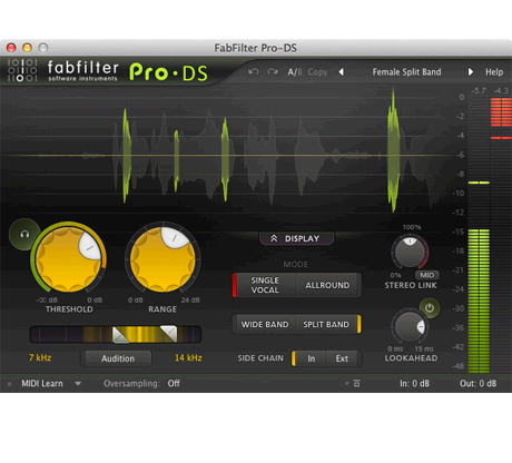 FabFilter Pro-DS offre tutto ciò di cui hai bisogno per ottenere il miglior risultato possibile, presentato in un'interfaccia semplice e facile da usare. Elaborazione a banda larga o a fase lineare suddivisa, un look-ahead opzionale fino a 15 ms, collegamento stereo regolabile con elaborazione opzionale solo mid o solo side, oversampling a fase lineare fino a quattro volte... è tutto lì.