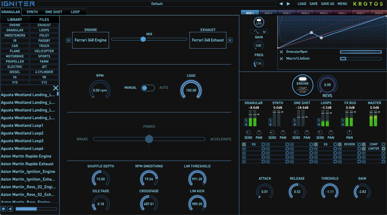 Igniter is the only solution of its kind to come jam-packed with over 20 performable vehicles and 1,943 audio assets from vehicles including Aston Martin, Ferrari, Porsche, Tesla, Harley Davidson, Huey UH-1H, Agusta Westland 119x, CH-47D Chinook, Bombardier Challenger, Cessna 560XL, skids, sweeteners and much more. Recordings come from Watson Wu, The Recordist, Sounding Sweet, George Vlad, Echo Peak and Flysound.