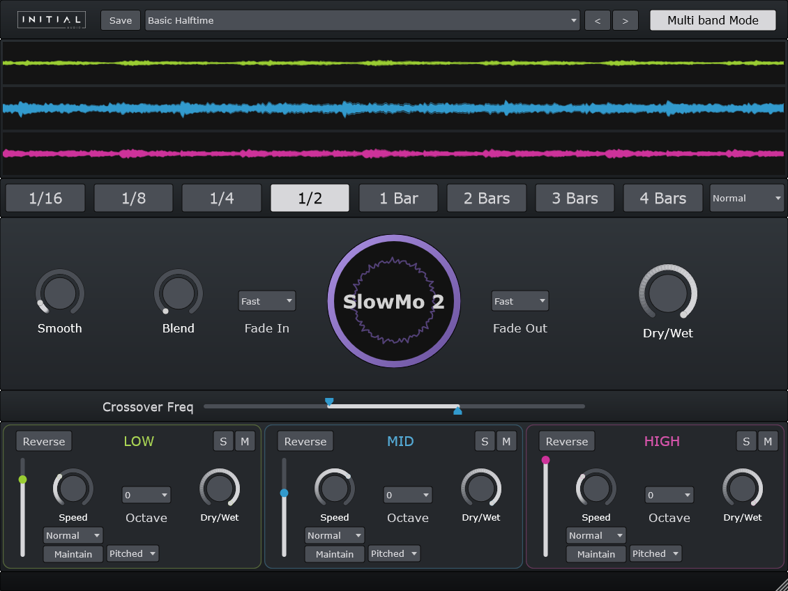 SlowMo 2 è un avanzato plugin per effetto half-time per Windows e Mac, progettato per rallentare i tuoi mix, strumenti, voci e canali di effetti fino al 50% (o più) in tempo reale. Basandosi sull'originale, introduce il processamento multibanda per un controllo preciso sulle bande di frequenza basse, medie e alte, consentendo impostazioni indipendenti per velocità, mantenimento del pitch, cambi di ottava, inversione e mix secco/umido per banda.