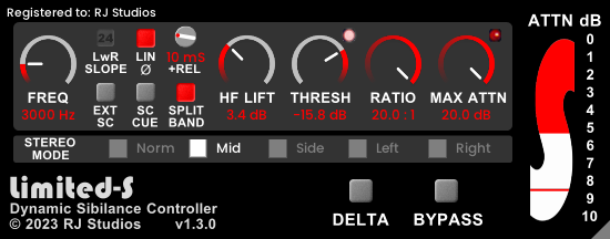 Limited-S è un De-Esser di tipo “soglia fissa” che lavora sui livelli di segnale di picco proprio come un limiter. Non cerca di monitorare il segnale complessivo e attenuare ciò che “pensa” sia sibilanza eccessiva. I De-Essers di quel tipo tendono a sovracompremere la sibilanza iniziale (produzione di balbettio) mentre controllano in modo insufficiente la sibilanza finale. Limited-S, invece, cattura solo i picchi di sibilanza più forti e offensivi. (La soglia può essere automatizzata se desiderato). Quando utilizzato su tracce stereo, Limited-S può operare sull'intero mix, solo sui Medi, solo sui Lati o solo a Sinistra o a Destra. Questo consente applicazioni sia nel missaggio che nel mastering, come il de-essing delle voci in un master (tipicamente centrato) lasciando i lati intatti. Il controllo High Lift di Limited-S consente di aggiungere luminosità a un mix mentre controlla simultaneamente le alte frequenze eccessive. Ottimo per le voci o per schiarire un master.