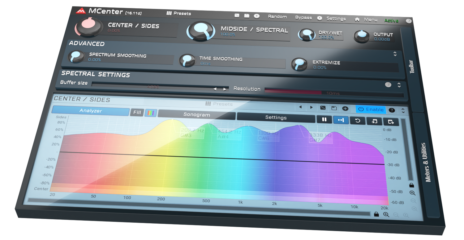 MCenter giver dig mulighed for at tage kontrol over den flygtige "phantom center" i dit stereosignal. MCenter anvender en kompleks spektrogram-algoritme, som adskiller, hvad der virkelig lyder stereofonisk, og hvad der virkelig lyder mono, hvilket ikke er tilfældet for mid/side processing - for eksempel er en hårdt panoreringet track 50% mid og 50% side fra mid/side processing perspektiv, selvom det naturligt lyder stereofonisk. MCenter er her ikke kun til mastering, men til enhver lejlighed, hvor ægte mid/side balance er nødvendig. Til mixning eller kreativ brug.
