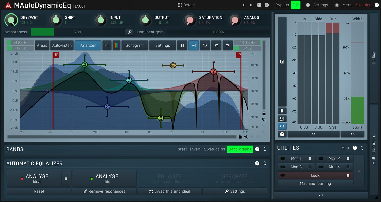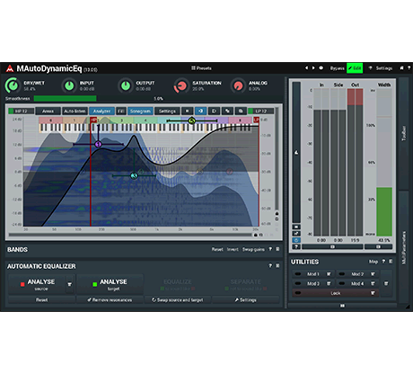 MAutoDynamicEq non solo mostra i risultati del tuo processamento, ma presenta anche un analizzatore integrato, sonogramma, aree spettrali e molto altro.
