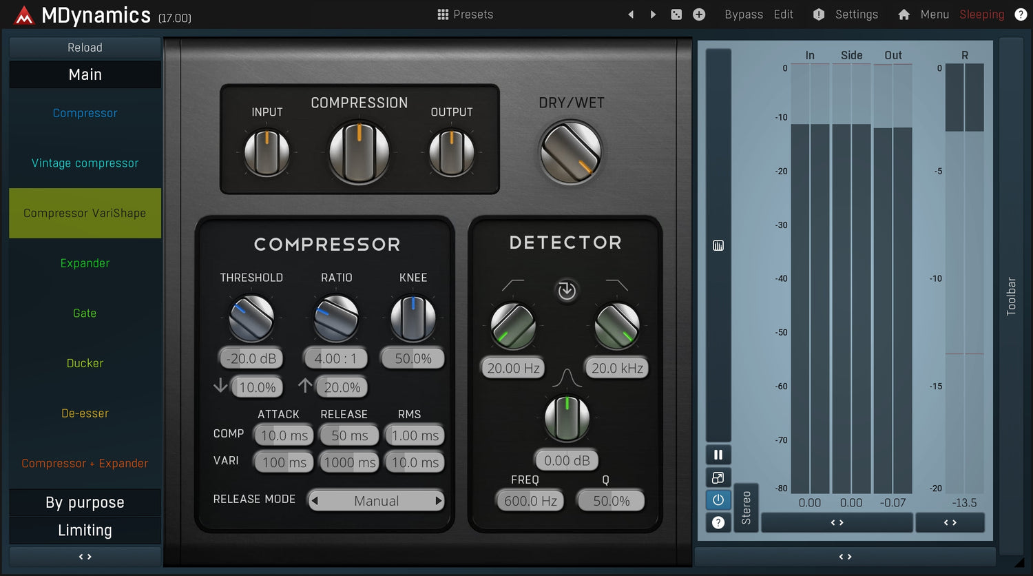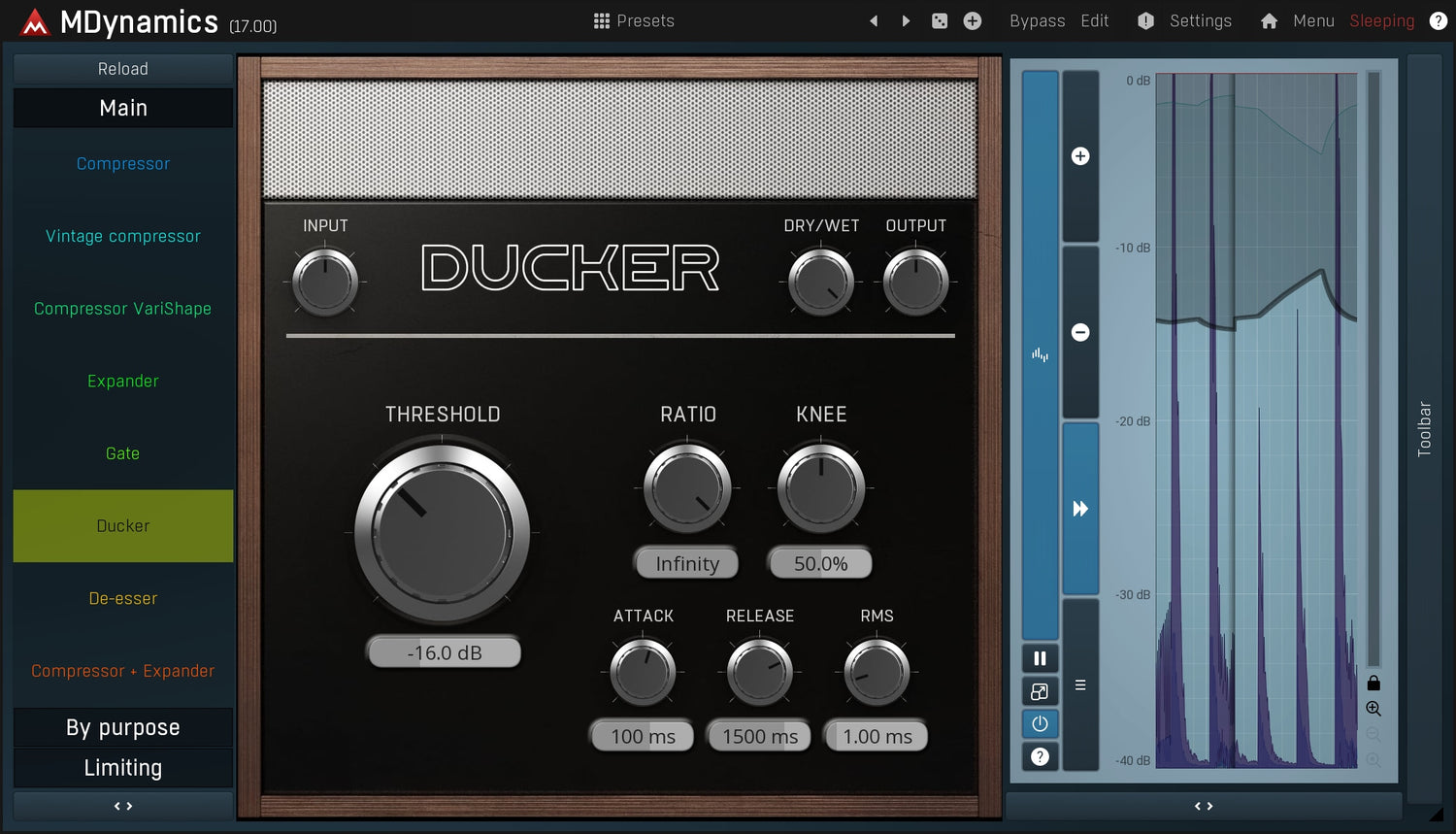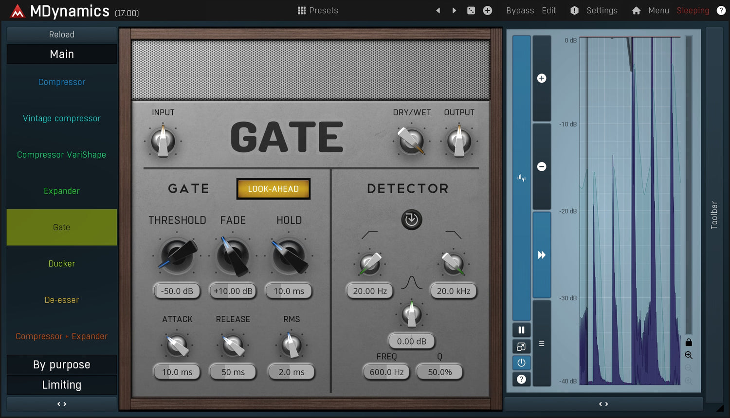 MDynamics può adattarsi a qualsiasi materiale audio grazie al suo estremamente versatile follower di inviluppo che presenta modalità di rilascio automatico, mantenimento del picco, lunghezza RMS, look-ahead, pre-filtraggio psicoacustico, forme personalizzate di attacco e rilascio, levigatura spettrale e molto altro ancora.