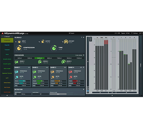 Ogni banda può fare tutto. Può essere un compressore, un espansore, un gate, qualsiasi combinazione, oppure puoi persino disegnare la tua forma di elaborazione per effetti più creativi. Aggiungi compressione parallela integrata, collegamento completo dei canali, elaborazione surround fino a 8 canali e molto altro, e MDynamicsMB diventa lo strumento definitivo per le dinamiche multibanda.