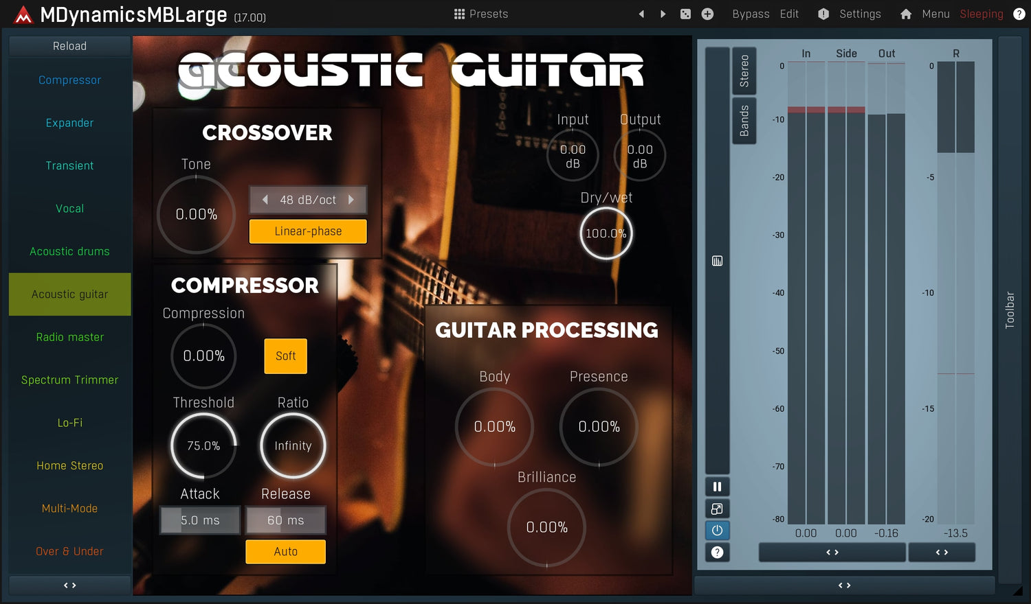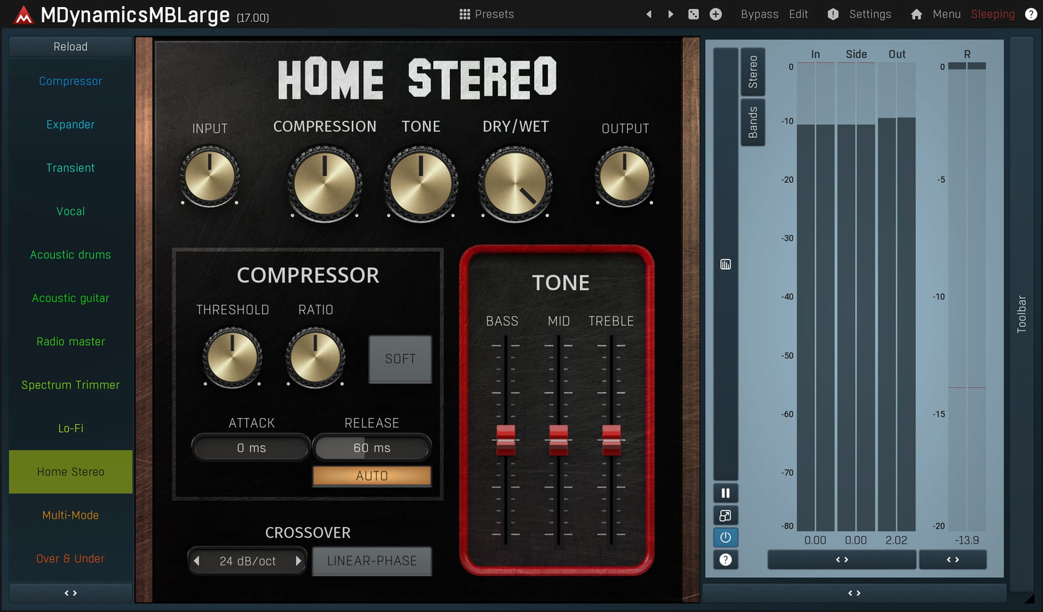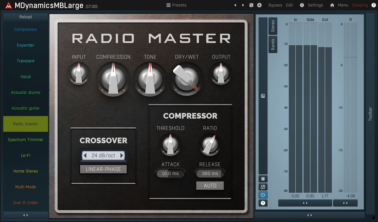 MDynamicsMB può suddividere l'input in 6 bande di frequenza separate, fornendo crossover analogici con separazione fino a 120dB/octava, crossover a fase lineare e crossover ibridi. Cosa fare con ciascuna di queste bande dipende da te.