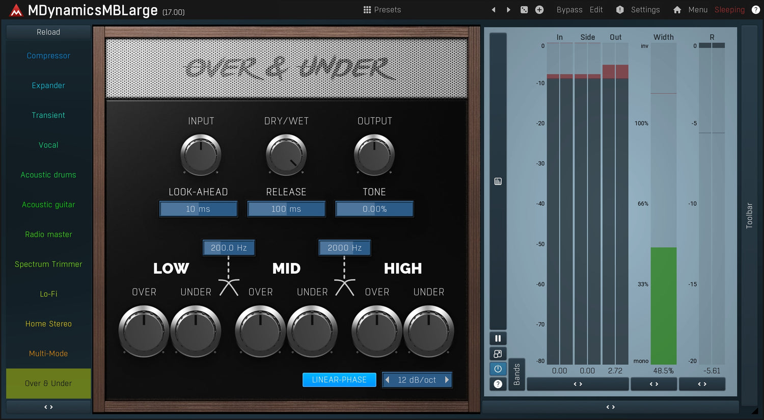 MDynamicsMB può adattarsi a qualsiasi materiale audio grazie al suo follower di inviluppo estremamente versatile, che presenta modalità di rilascio automatico, mantenimento del picco, lunghezza RMS, look-ahead, pre-filtraggio psicoacustico, forme di attacco e rilascio personalizzate, levigatura spettrale e molto altro. E ovviamente, può essere diverso per ogni banda.