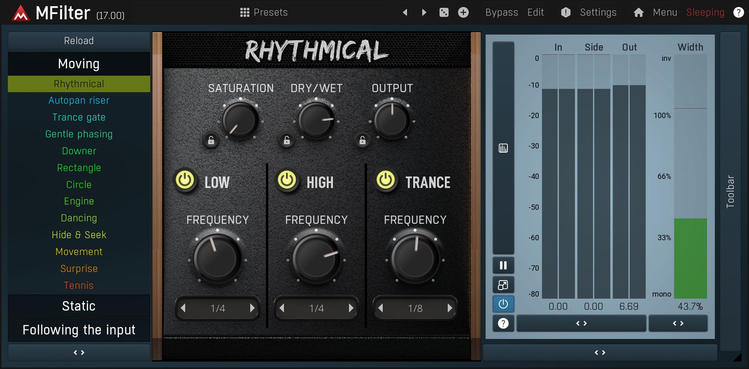 Ogni volta che hai bisogno di aggiungere un po' di movimento a un suono altrimenti statico, un filtro è uno dei primi processori da provare. MFilter può probabilmente fare più di quanto tu possa immaginare che un filtro sia in grado di fare.