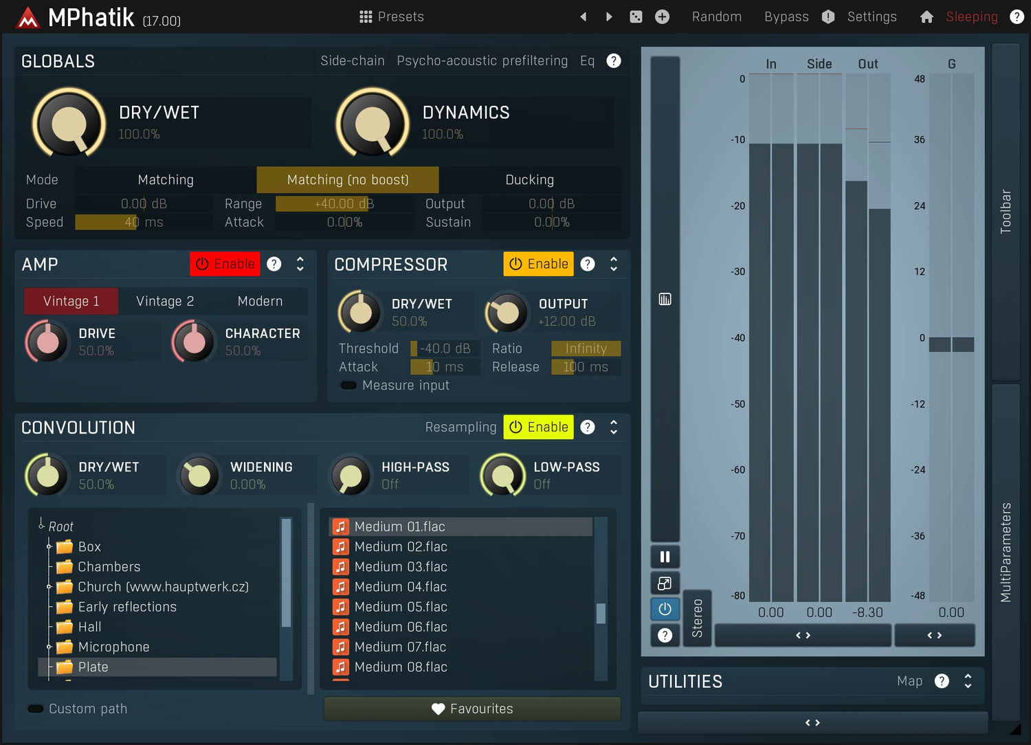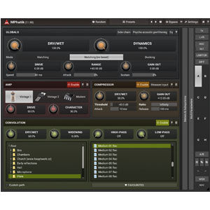 MPhatik è dotato di un potente simulatore di amplificatore, riverbero a convoluzione (che presenta tutti i tipi di risposte all'impulso da riverberi a piastra a sale, stanze ecc., o i tuoi file IR ovviamente) e un compressore. Se non basta, puoi anche utilizzare l'ingresso side-chain per pilotare MPhatik e elaborare l'audio con i tuoi strumenti, lasciando a MPhatik il compito di ripristinare le dinamiche.