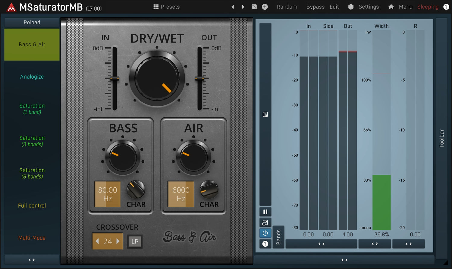 La saturazione è un tipo molto speciale di distorsione morbida conosciuta da tubi e nastri. Può fornire un certo sapore armonico, migliorare il contenuto di bassi e sub-bassi e molto altro. MSaturatorMB è un plugin di saturazione estremamente musicale e versatile, che contiene anche un generatore armonico digitale. MSaturatorMB combina il meglio dei mondi analogico e digitale.