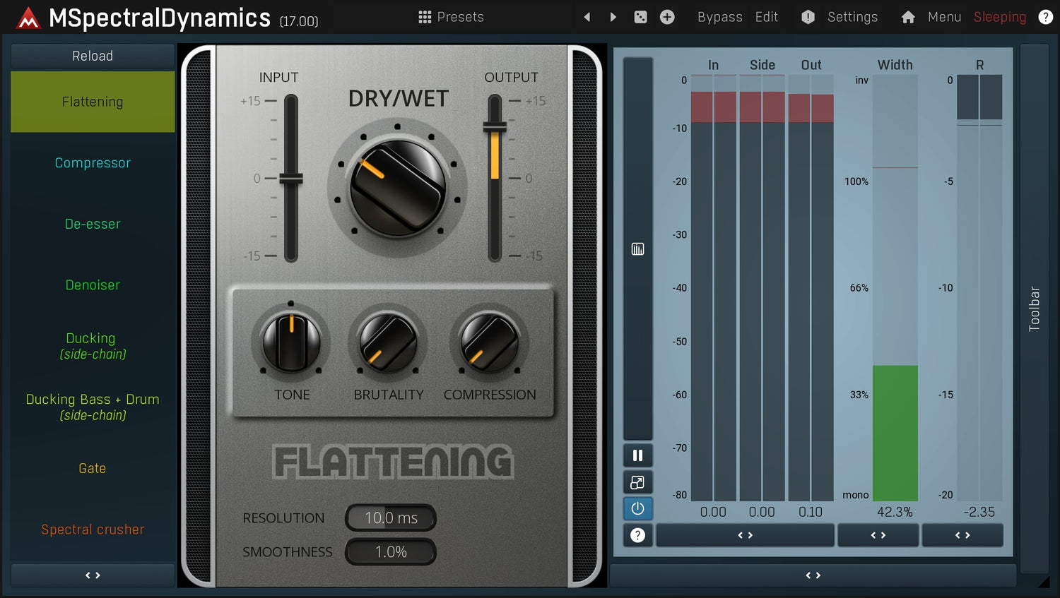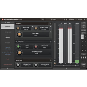 MspectralDynamicsLE può essere un compressore, un espansore, un gate… Otto modalità di base offrono un suite dinamica completa. Con MSpectralDynamicsLE puoi aspettarti niente meno che una qualità audio cristallina!