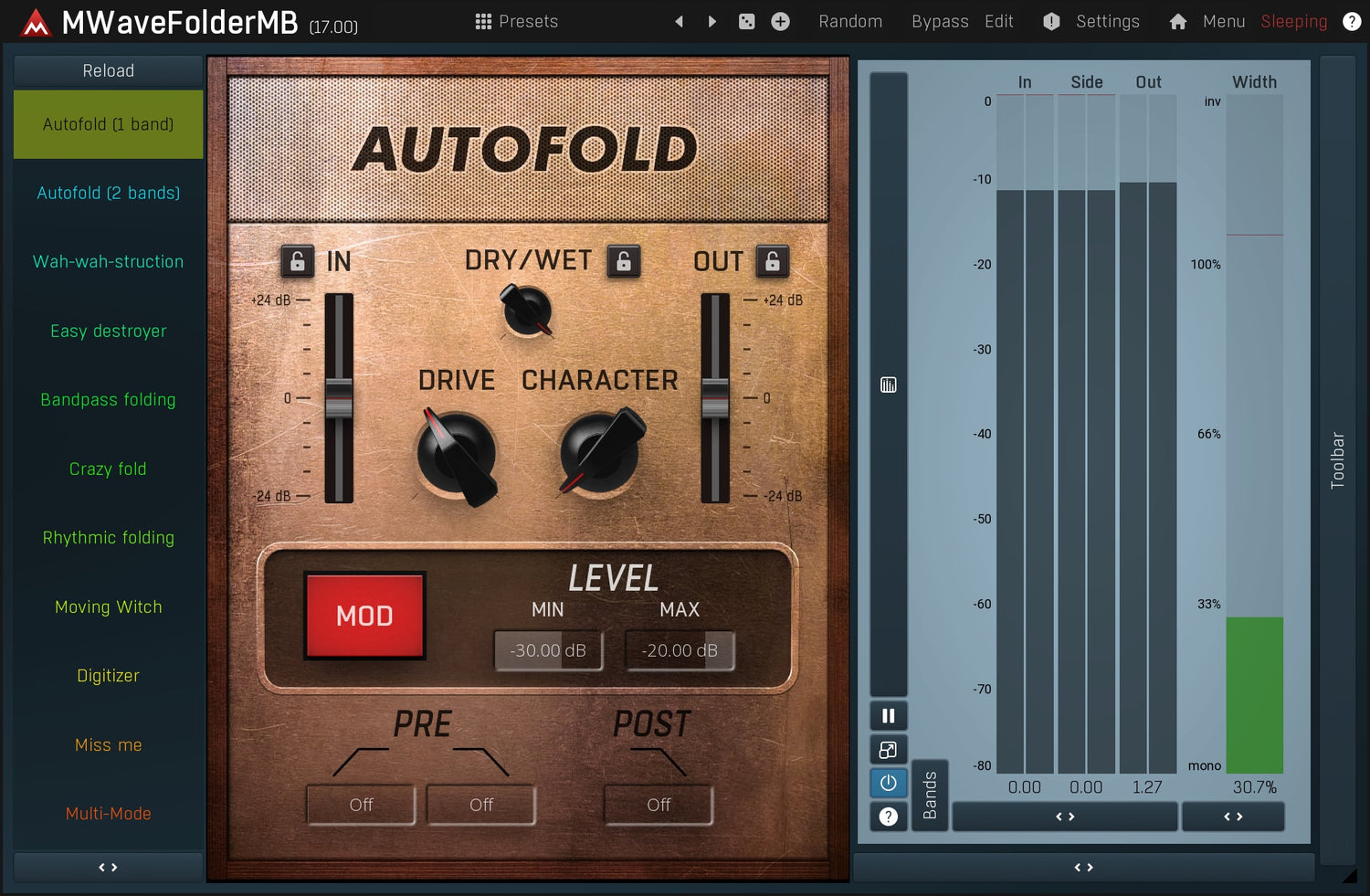 Distorcere un segnale a banda larga può essere utile, ma di solito è troppo travolgente e non offre molte opzioni. MWaveFolderMB ti consente di suddividere il segnale di ingresso in fino a 6 bande e utilizzare una forma personalizzata diversa in ciascuna di esse. Puoi persino modulare le forme per una vera follia distorta.