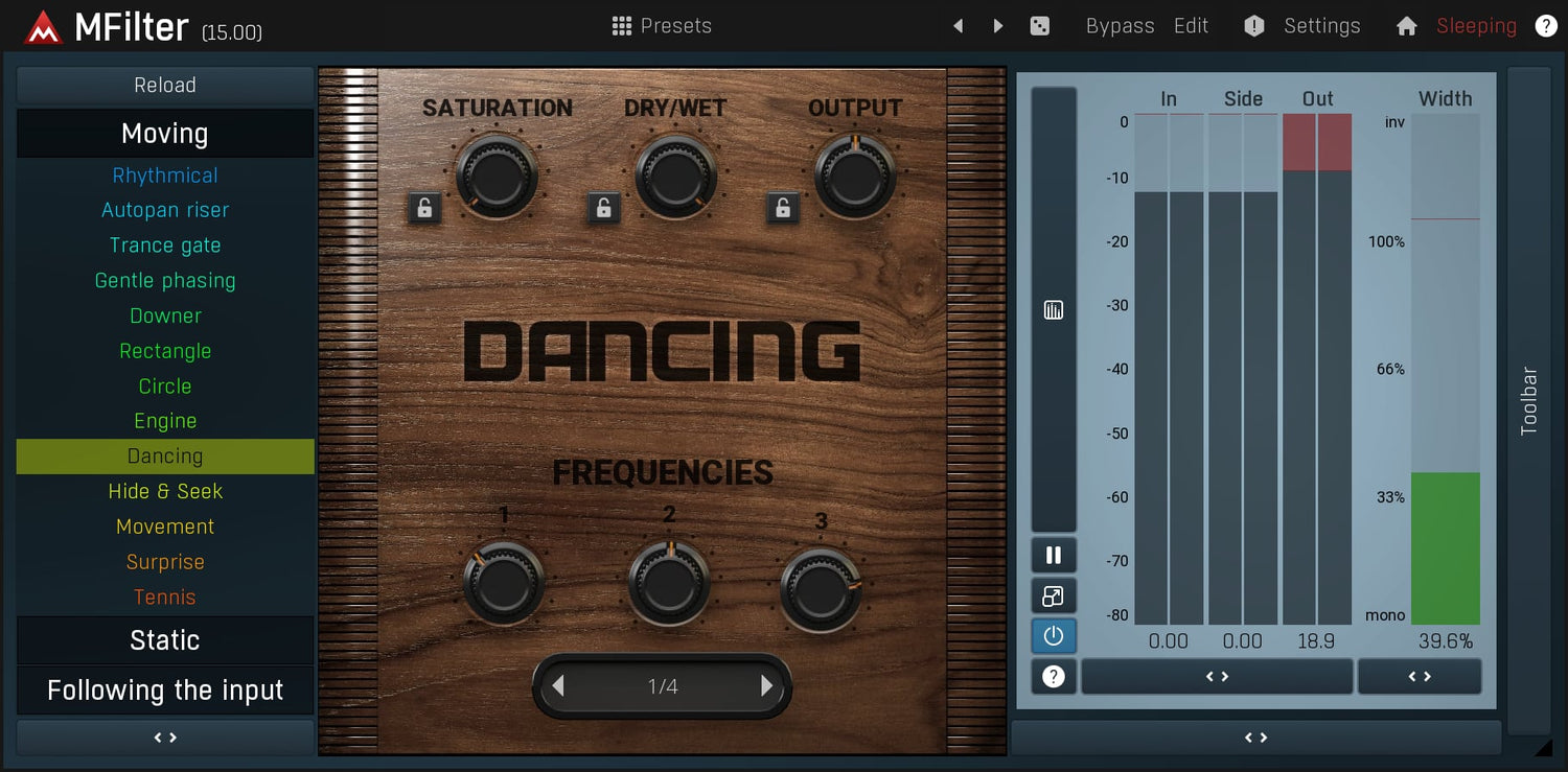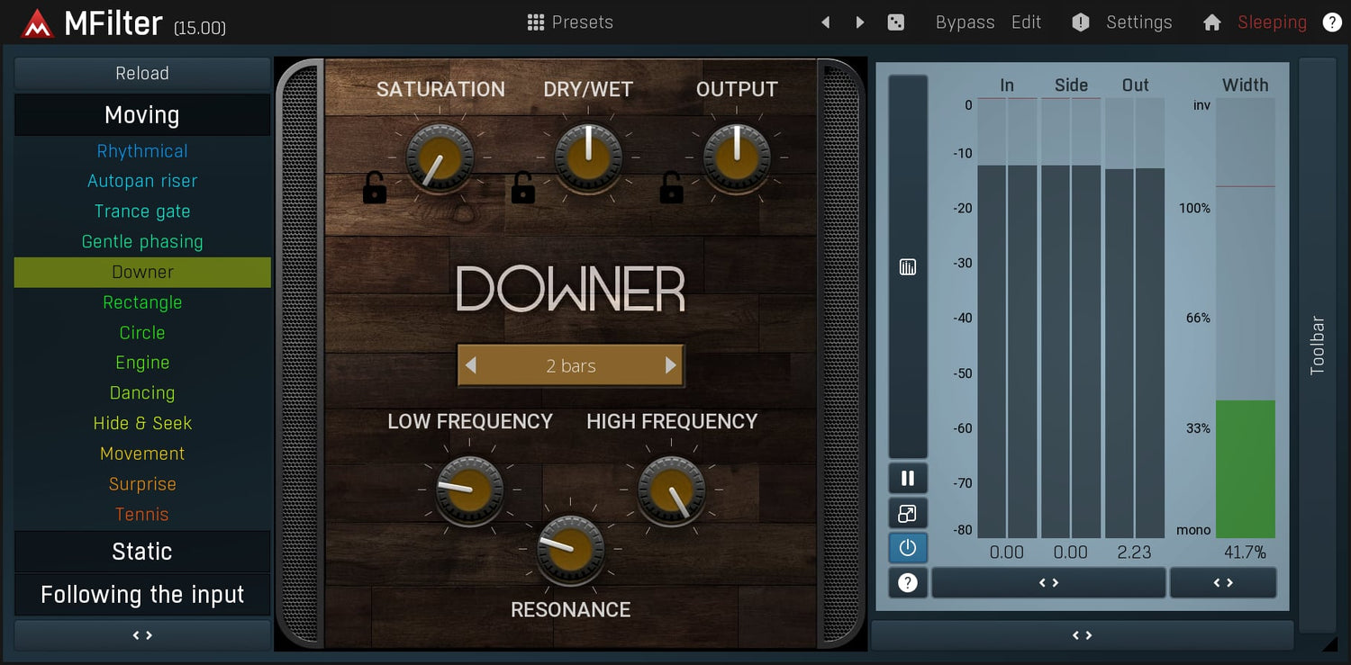 Whenever you need to add some movement to an otherwise static sound, a filter is one of the first processors to try. MFilter can probably do more than you ever think a filter would be capable of.