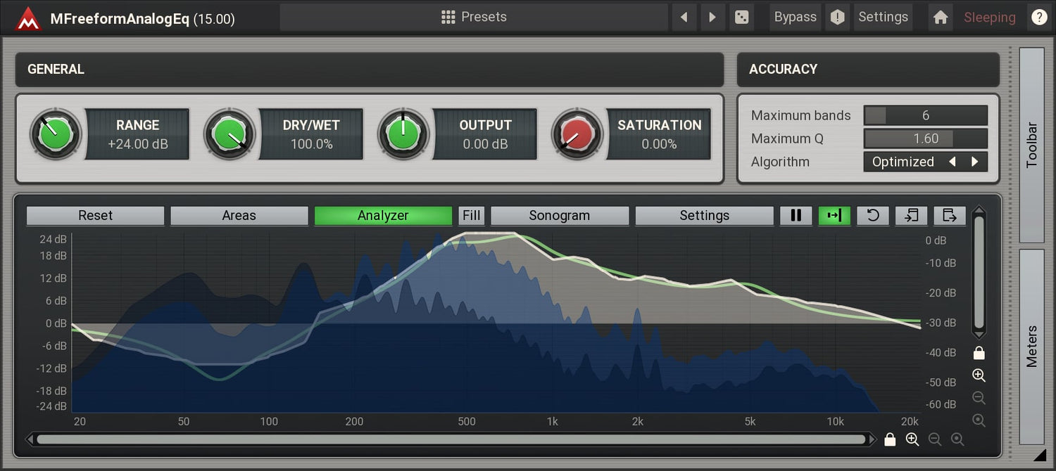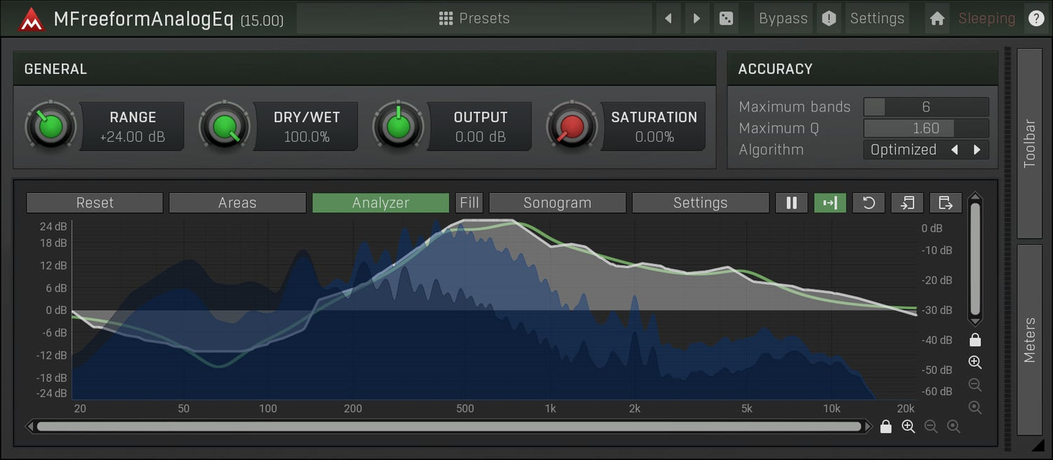 Parametric equalizers may sound great, but they can be obtuse to use. MFreeformAnalogEq is simple. Just draw the equalization that you want and MFreeformAnalogEq will make it happen with the high audio quality of parametric analog filters!