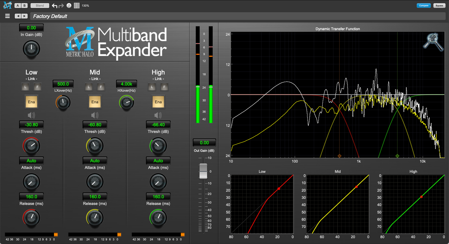 La rete di crossover a 3 bande coerente in fase dirige l'audio verso tre espansori indipendenti che puoi configurare per sopprimere dolcemente il rumore al di sotto della soglia che specifichi. Gli espansori possono anche essere configurati per cambiare la sensazione dei pattern ritmici sopprimendo elementi che vengono suonati più delicatamente – tutto in modo sensibile alla frequenza.