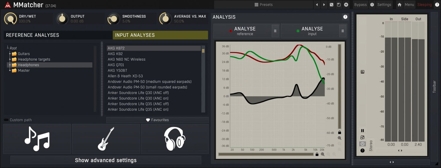 MMatcher is a revolutionary plugin designed to streamline your audio production workflow by providing precise spectrum, loudness, and stereo field matching. It can do so many things... MMatcher is indispensable for mastering to get you the right sound. MMatcher lets you fix your headphones and monitors so that you can properly use them for mixing and mastering. You can use MMatcher to play with guitar/bass tones and who knows what else!