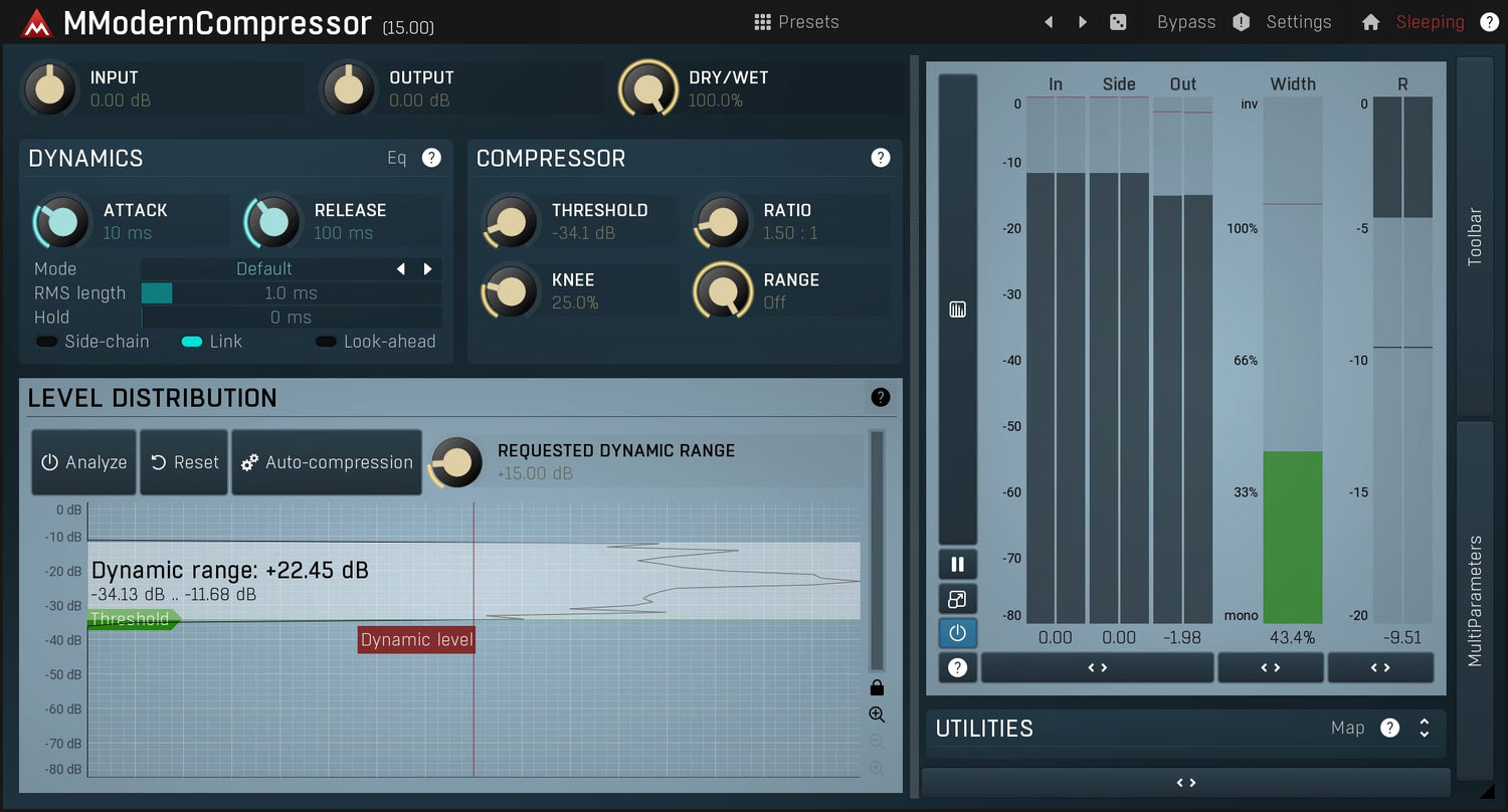 MModernCompressor is a perfect mix of great features and ease-of-use. It provides astonishing sound with the exact amount of features needed by a versatile compressor.