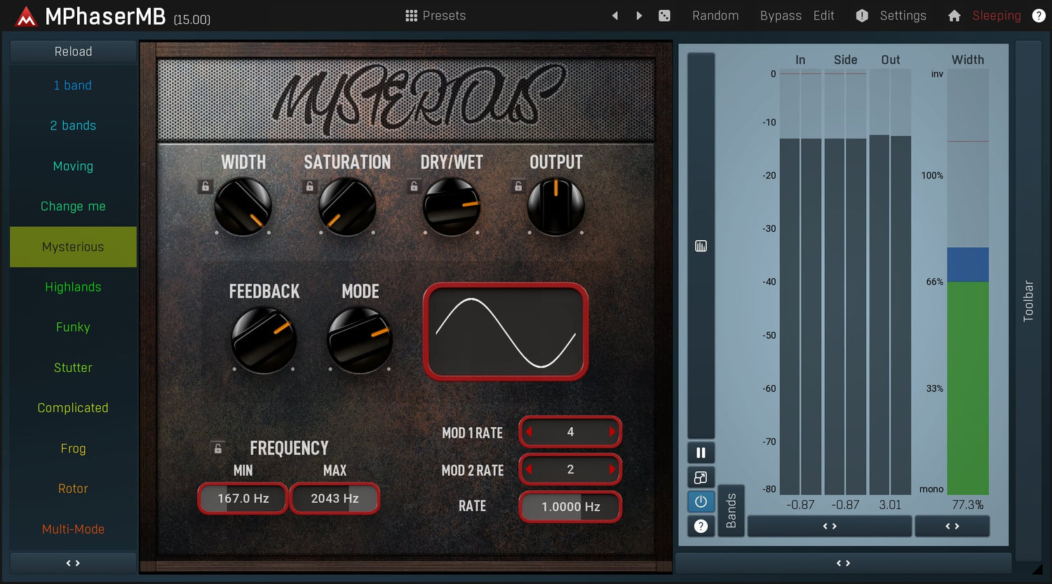 Phasers are commonly used on keyboards, guitars and other instruments to bring some movement and spatialization. MPhaserMB is an extremely versatile and musical-sounding phaser, which is perfect for all kinds of audio material.