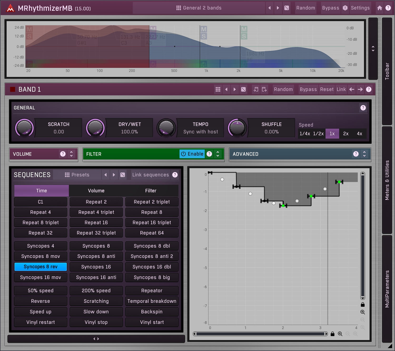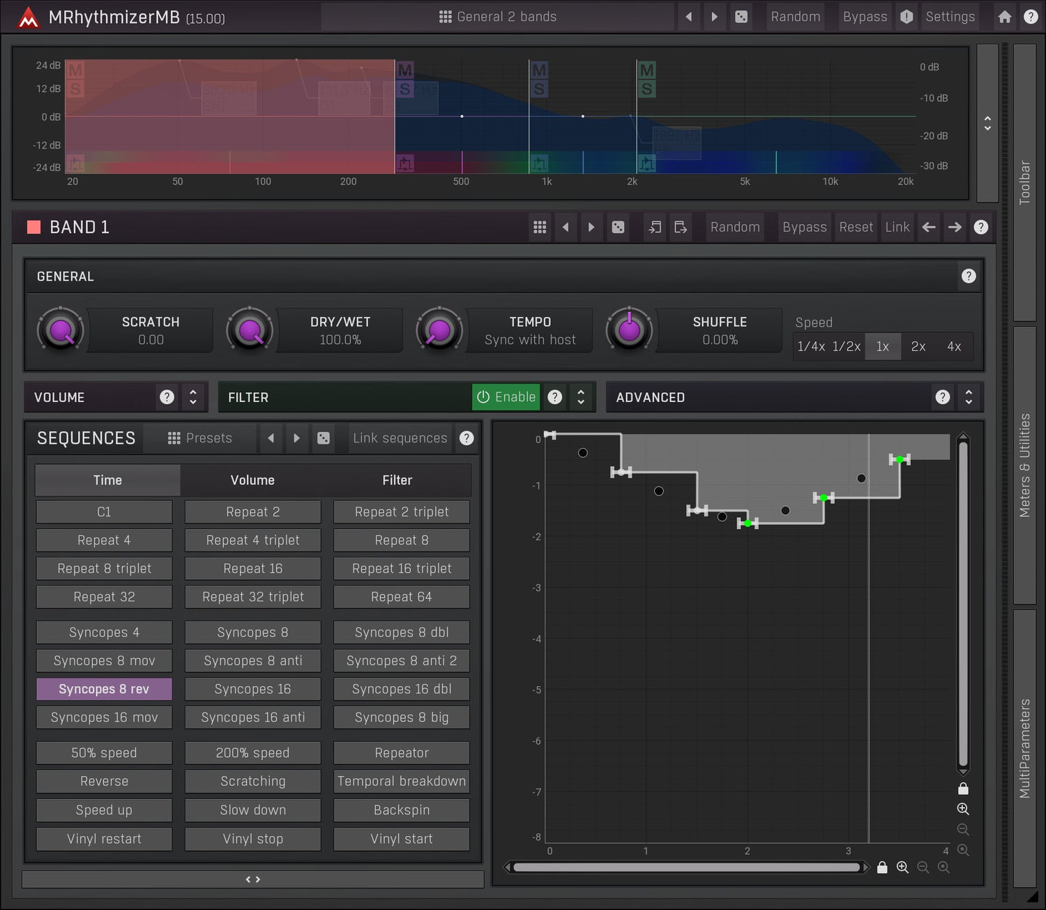 From gating to glitching, repeating hits to scratching, all with stunning audio quality and up to 6 distinct bands, that's MRhythmizerMB. A unique time manipulation effect that uses an integrated sequencer to control time, volume and filters. MRhythmizerMB brings your music to life, say goodbye to boring audio performances!