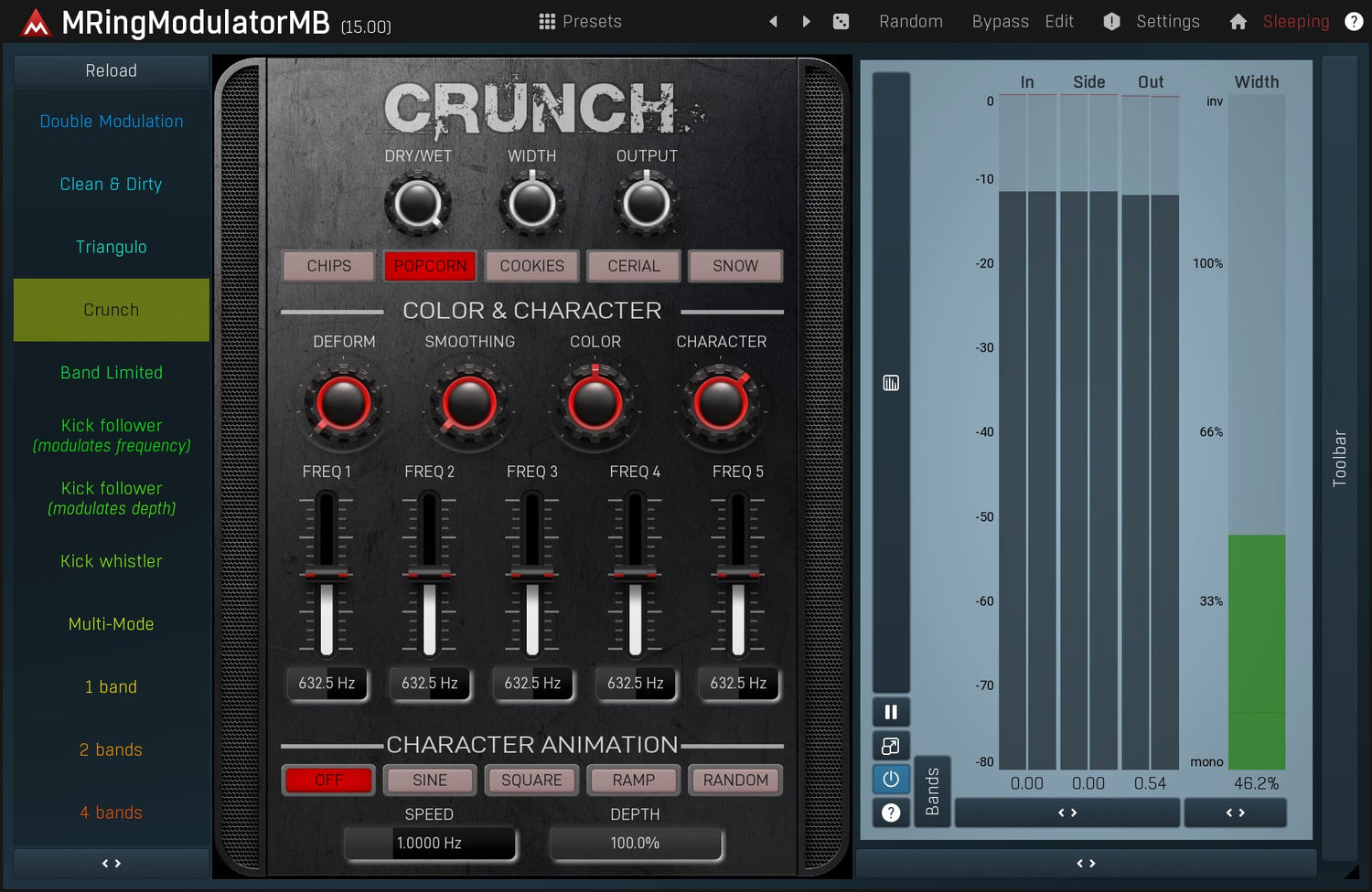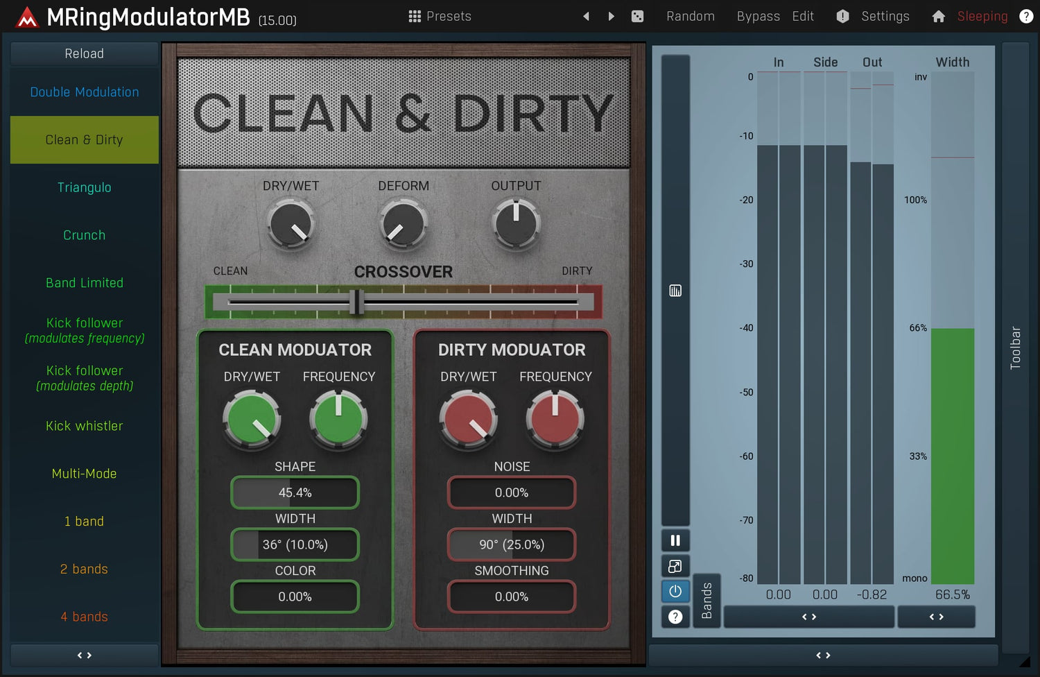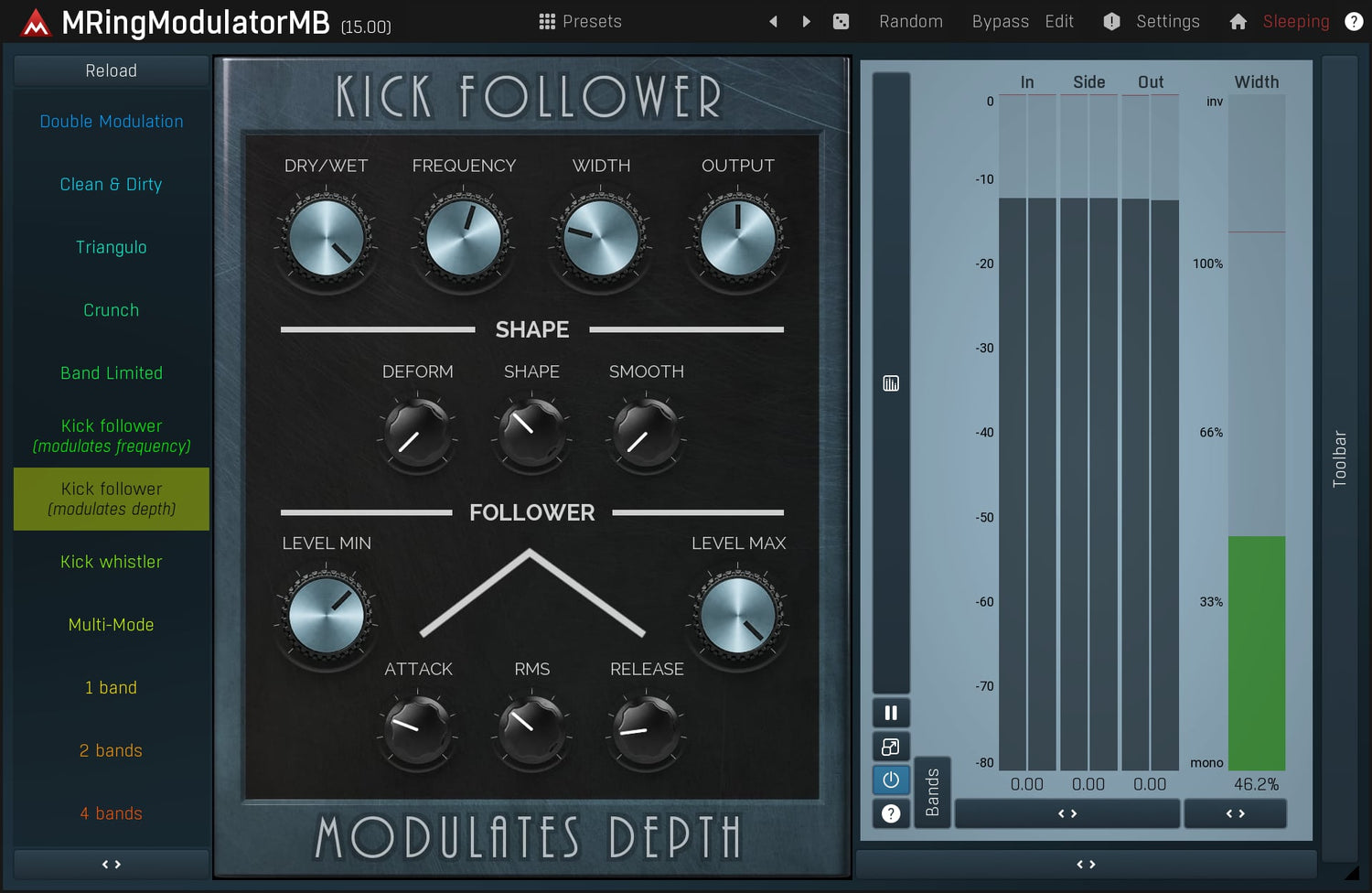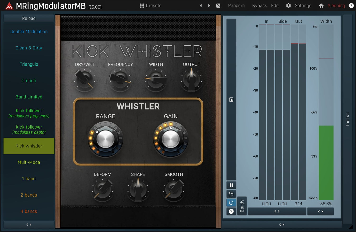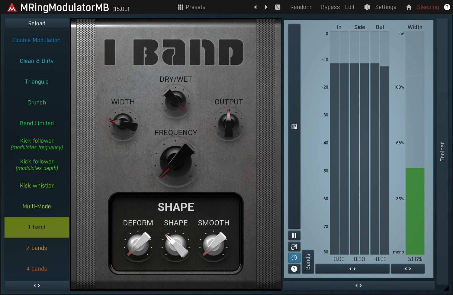 Ring-modulators are quite specialized effects used especially on non-harmonic audio materials, such as drums. MMultiBandRingModulator is a very advanced ring-modulation effect, which is due to its multiband nature highly suitable for many types of audio.