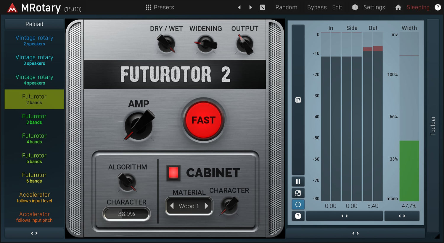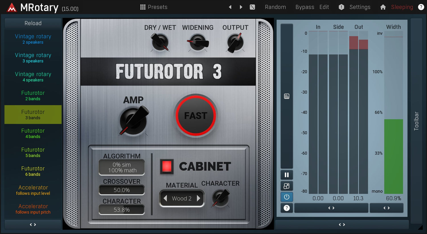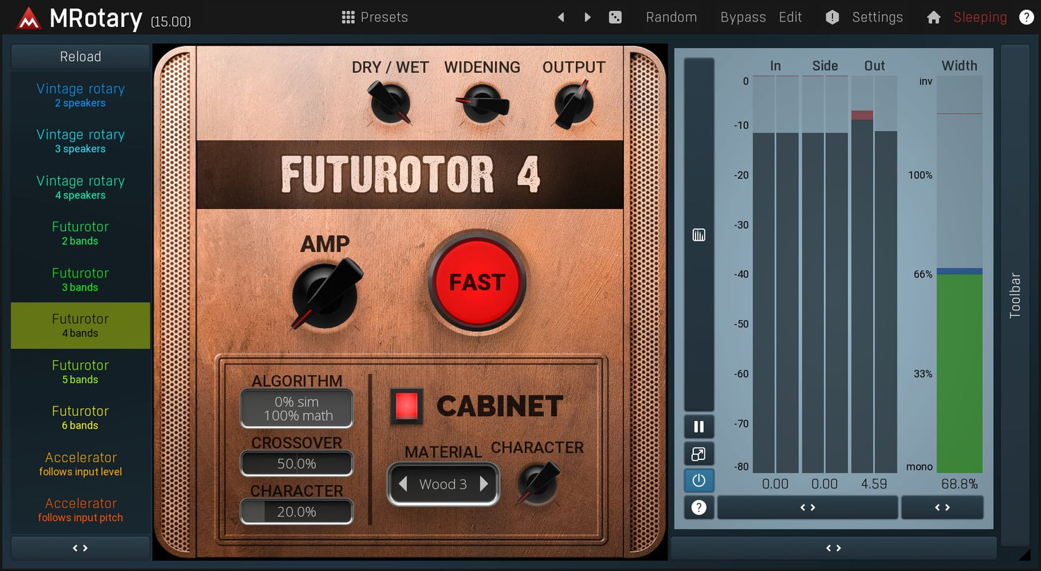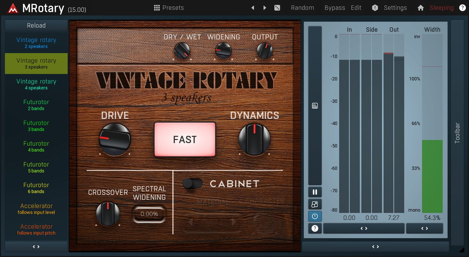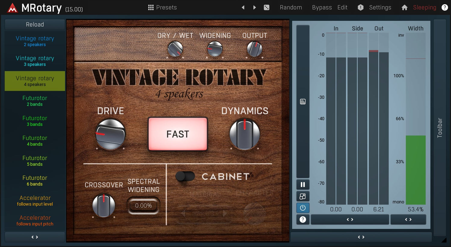 MRotary is the ultimate rotary simulator, which can deliver not only the great vintage sound but also futuristic algorithmic sound featuring up to 6 speakers at once. You can design your own cabinet using any material from wood to glass, process the rotary signal using a fully-featured dynamic equalizer and much more.