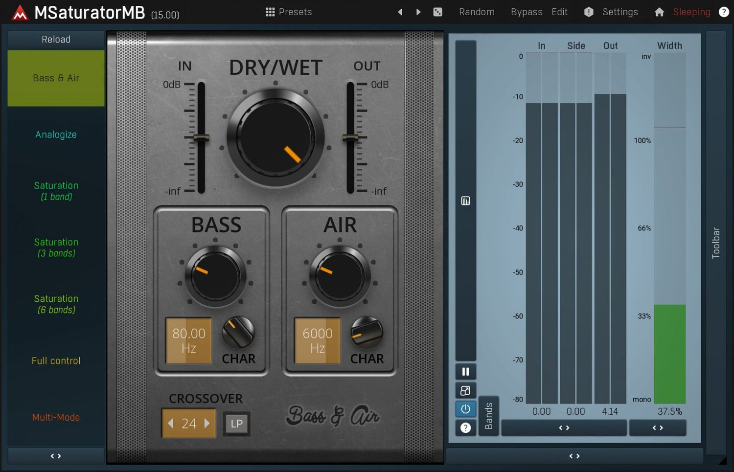Saturation is a very special type of smooth distortion known from tubes and tapes. It can provide some harmonic flavour, improve bass and sub-bass content and much more. MSaturatorMB is an extremely musical and versatile saturation plugin, which also contains a digital harmonic generator. MSaturatorMB combines the best from both the analogue and digital worlds.