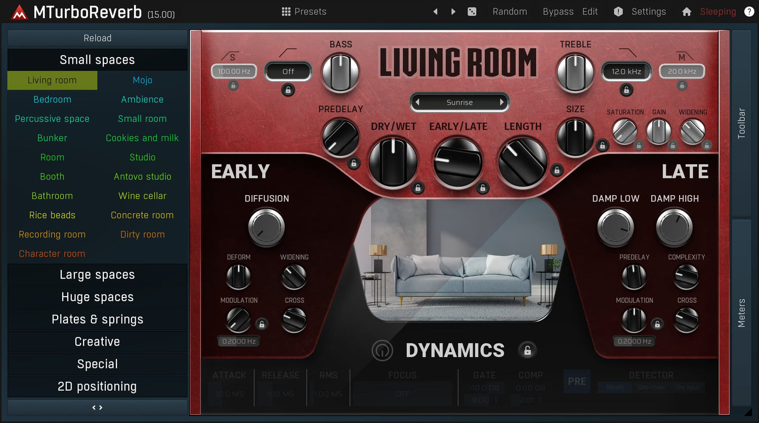 Each of these reverbs feature all the necessary controls such as dry/wet or reverb length, but also more special ones, such as a dynamics section or side high-pass filter. Switching between the reverbs is one click away, which tremendously speeds up your creative workflow.