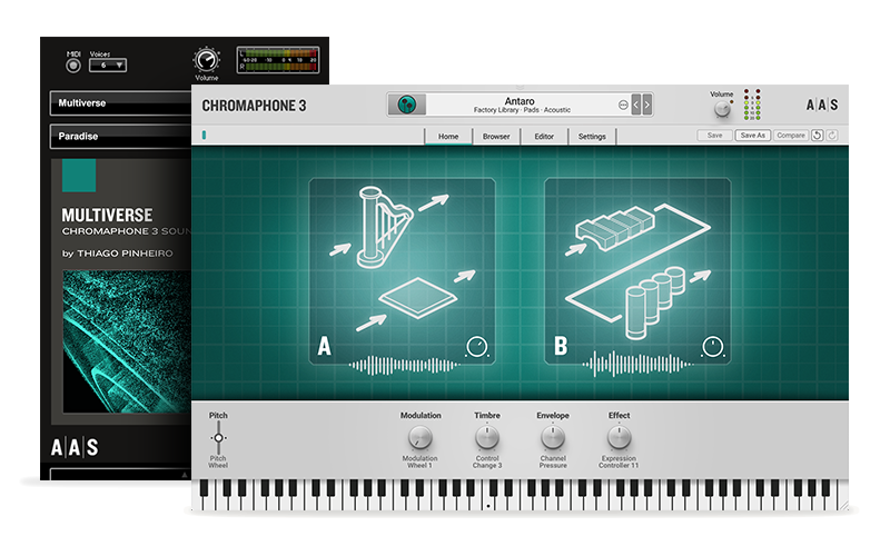 The synthesis expertise of acclaimed virtuoso and music technology pioneer Thiago Pinheiro is at your fingertips, with each patch overflowing with interactive possibilities and instantly useful combinations. From organic sounds to sci-fi scores, from abstract ambiences to cutting edge grooves, transitions and unique arpeggiators: surprise yourself with Multiverse’s full expression, responsiveness and sonic depth.
