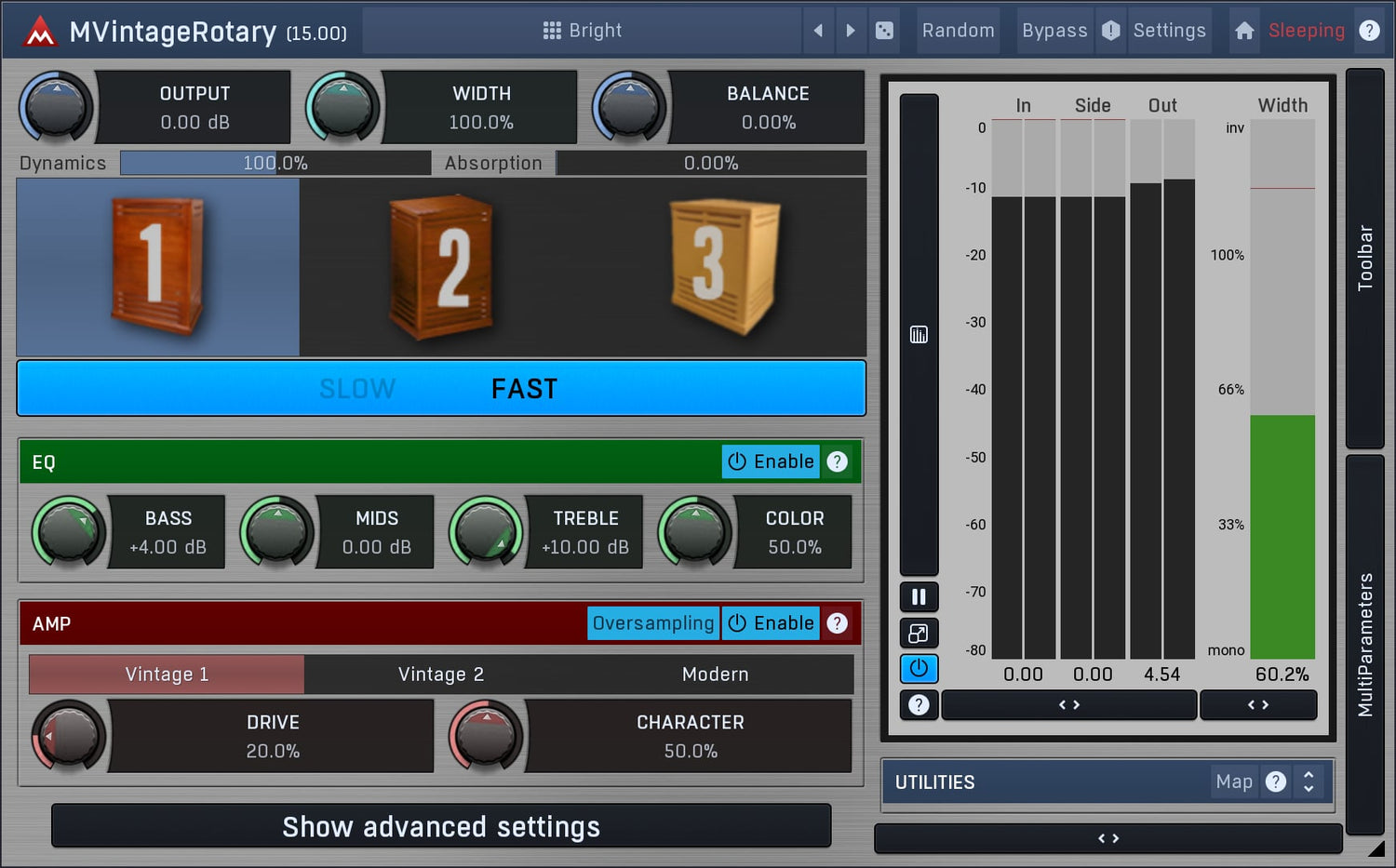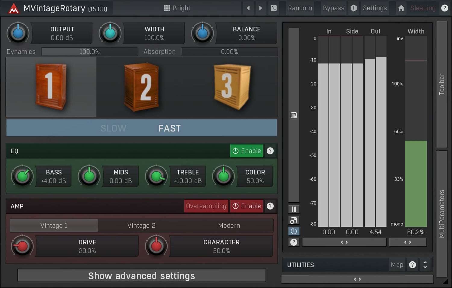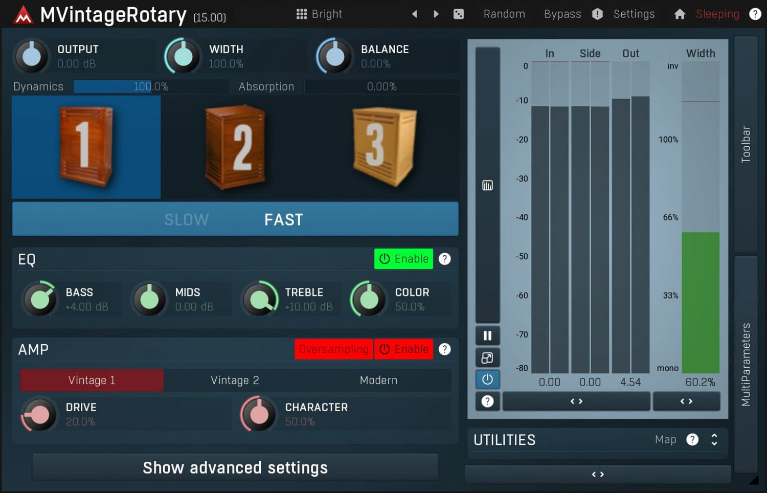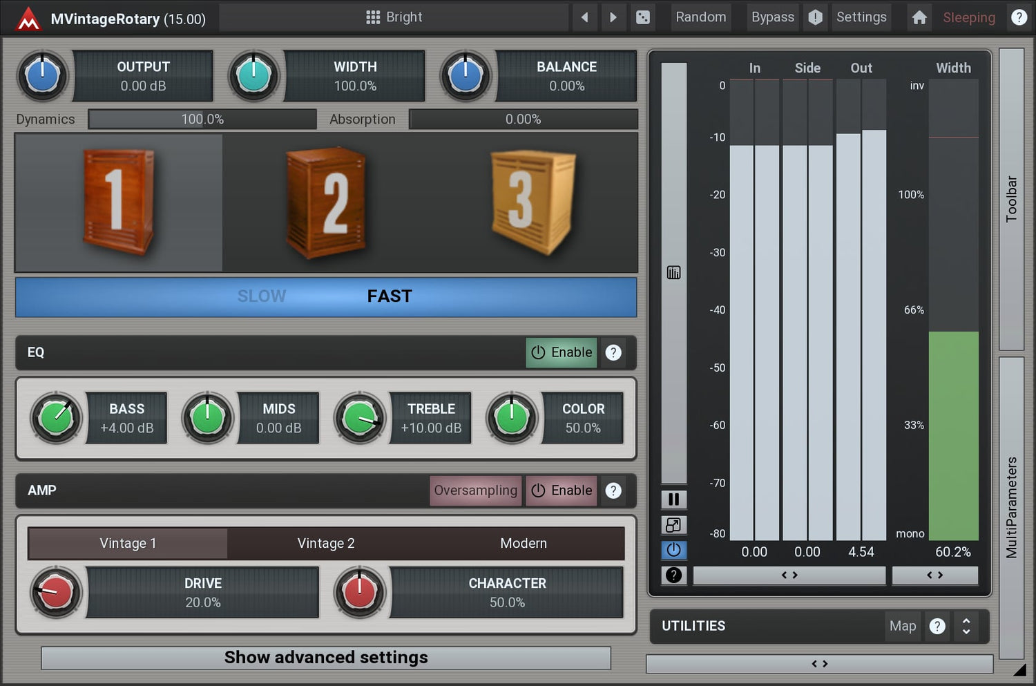 MVintageRotary is a perfect sounding rotary simulation based on the famous Leslie® cabinets. Unlike the original, this one also features several advanced features. Designed for organs, but perfect for keyboards, guitars and many other instruments.