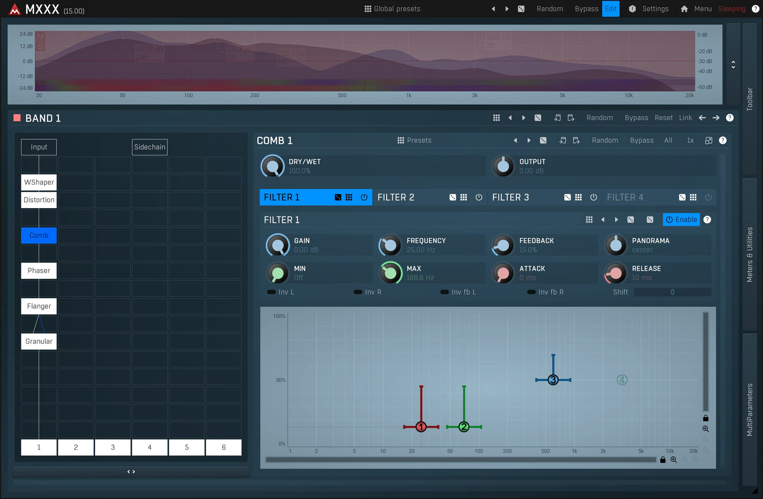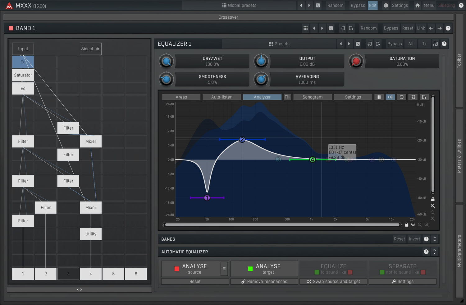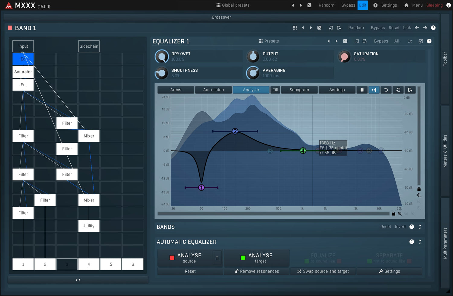 MXXX is the ultimate effect. It is a modular beast containing all our effects in a simple interface with an automatic routing matrix, super-versatile modulators and much more. It lets you do everything from simple equalization and compression to the wildest and most creative processing.
