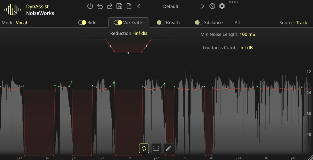Il Vox-Gate alimentato da AI funziona in base all'attività vocale per rimuovere pause e silenzi, eliminando la necessità di impostare una soglia aggiuntiva. Questo metodo previene anche il taglio accidentale della prima o dell'ultima sillaba, un problema comune con i gate esistenti, a causa di un'apertura o chiusura errata del gate.