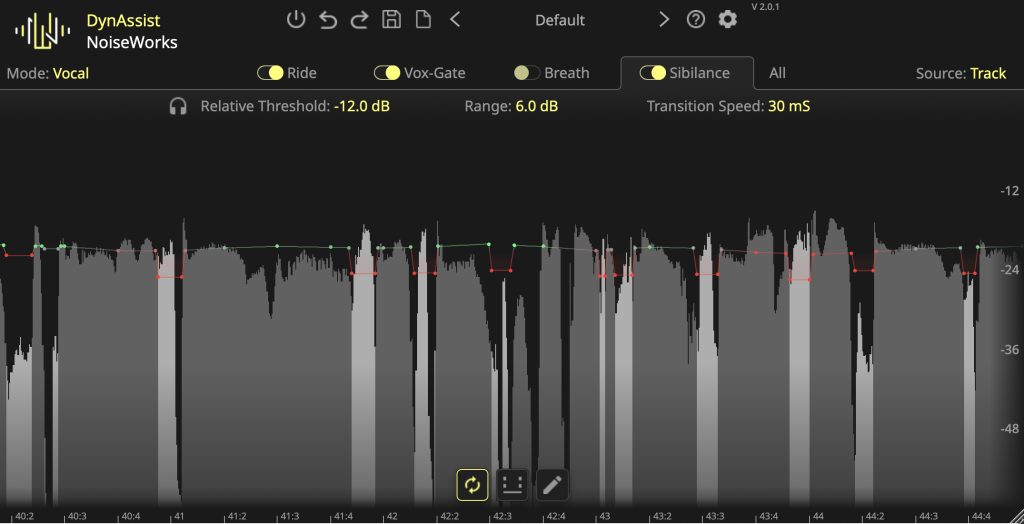 Nell'onda sonora di DynAssist, la sibilanza è evidenziata in grigio chiaro. L'automazione sovrapposta fornisce informazioni dettagliate su cosa accade a ciascuna sibilanza.