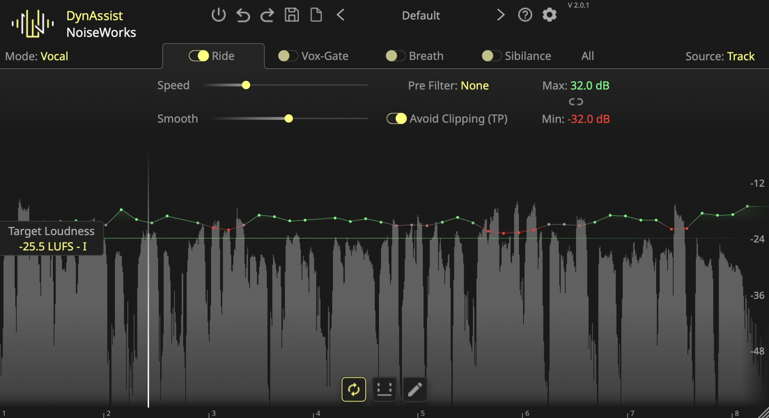DynAssist regola il volume alla Loudness Target in LUFS-I. Grazie al ‘lookahead infinito’ abilitato da ARA*, si prevengono artefatti di pumping. Questo era un problema comune con i precedenti vocal riders.