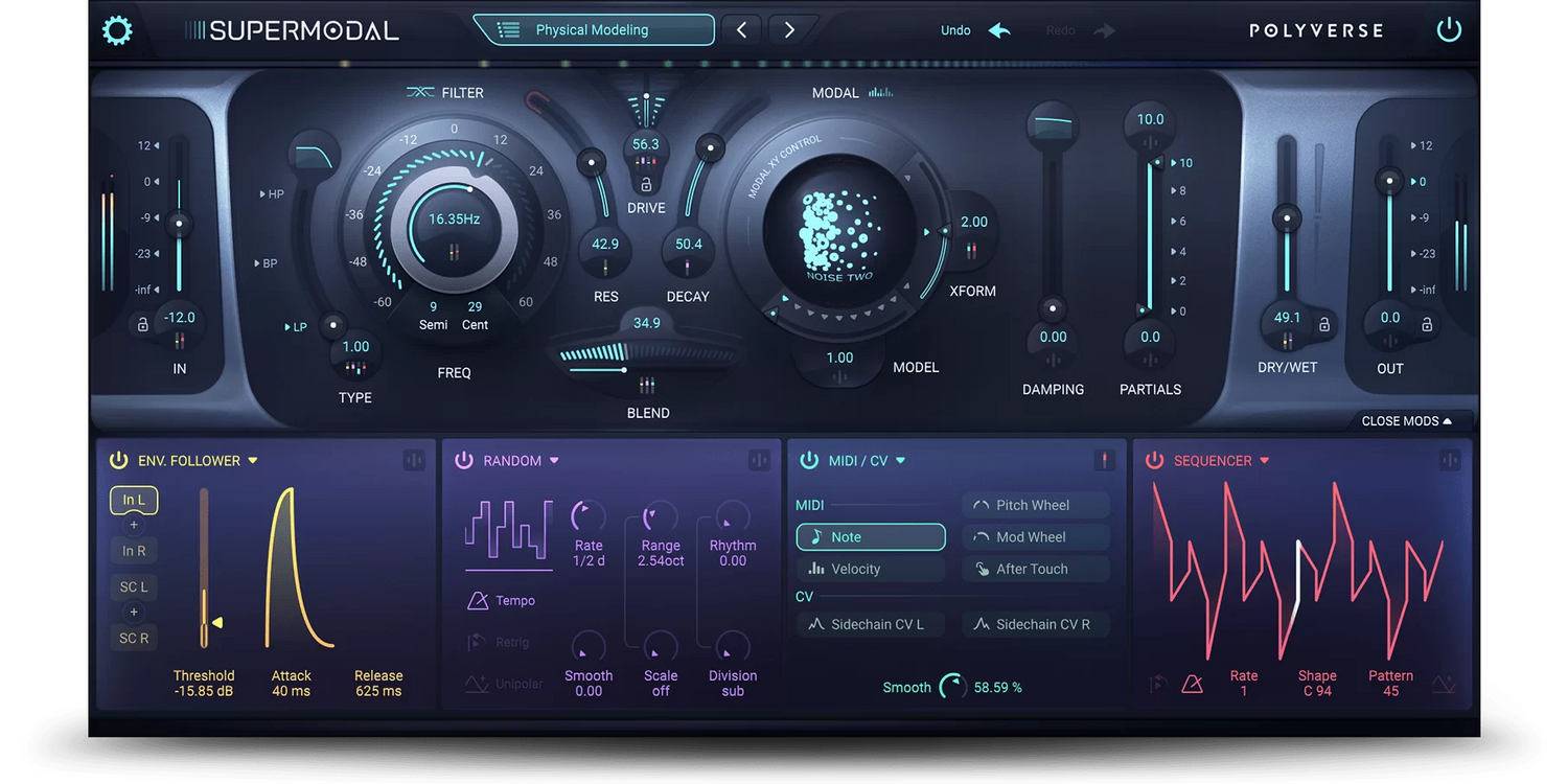 Supermodal è un filtro potente e unico con capacità di design sonoro senza pari che farà risuonare la tua musica. Rimodella tracce ordinarie utilizzando il suo potente filtro Modal che emula le caratteristiche sonore modellate da un'ampia gamma di corpi risonanti. Combinato con un filtro a stato variabile parallelo e un sistema di modulazione espansivo, un singolo segnale audio può essere manipolato in una vasta gamma di frequenze per creare paesaggi sonori cinematografici scintillanti, ritmi pulsanti, pad con movimento armonico, o qualsiasi altra cosa tu possa immaginare.